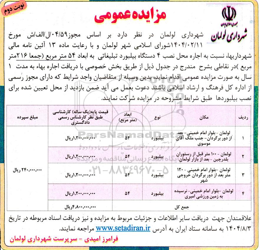شهرداری لولمان در نظر دارد بر اساس مجوز 04/59/ل/ الف/ ش مورخ 1404.02.11 شورای اسلامی شهر لولمان و با رعایت ماده 13 آئین نامه مالی شهرداری ها نسبت به اجاره محل نصب 4 دستگاه بیلبورد تبلیغاتی به ابعاد 54 متر مربع (جمعا 216 متر مربع) در نقاطی بشرح مندرج در جدول ذیل از طریق بخش خصوصی با دریافت اجاره بهاء به مدت 1 سال به صورت مزایده عمومی اقدام نماید، بدین وسیله از متقاضیان واجد شرایط که دارای مجوز رسمی از اداره کل فرهنگ و ارشاد اسلامی باشند دعوت بعمل می آید ضمن بازدید از محل تعیین شده برای نصب بیلبوردها طبق شرایط مشروحه در مزایده شرکت نمایند.