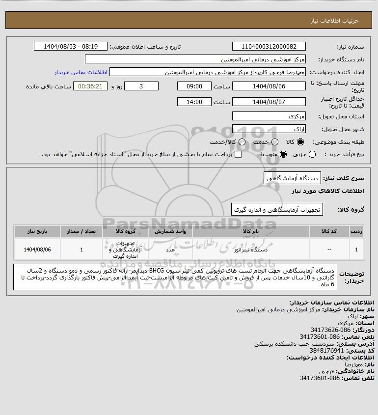 استعلام بها و موضوع استعلام استعلام دستگاه آزمایشگاهی به اطلاع کلیه شرکتها و افراد متخصص واجد شرایط میرساند، آگهی گذار در نظر دارد از طریق استعلام بها، نسبت به انتخاب و دریافت پیشنهادات اقدام نماید. این استعلام با کد آگهی ثبت شده در سامانه خبرگزاری پارس نماد : 9744085 منتشر شده است. مشخصات استعلام : تاریخ شروع استعلام: 1404/08/03 آخرین مهلت ارسال پیشنهاد قیمت : 1404/08/06 و محل اجرای پروژه : استان مرکزی میباشد. استعلام قیمت مورد درخواست : استعلام دستگاه آزمایشگاهی با دستهبندیهای تخصصی و گروه های مرتبط : خدمات و تجهیزات آزمایشگاهی و پزشکی, استعلام اطلاع رسانی میگردد.