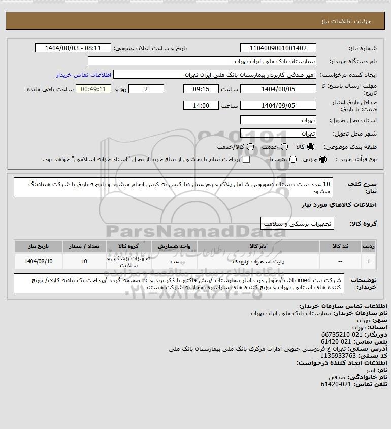 استعلام 10 عدد ست دیستال هموروس شامل پلاک و پیچ عمل ها کیس به کیس انجام میشود و باتوجه تاریخ با شرکت هماهنگ میشود, استعلام 10 عدد ست دیستال هموروس شامل پلاک و پیچ عمل ها کیس به کیس انجام میشود و باتوجه تاریخ با شرکت هماهنگ میشود