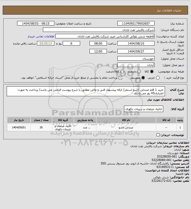 | 1 | -- | صندلی تاشو | عدد | اثاثیه، مبلمان و تزیینات دکوری | 30 | 1404/09/01 |