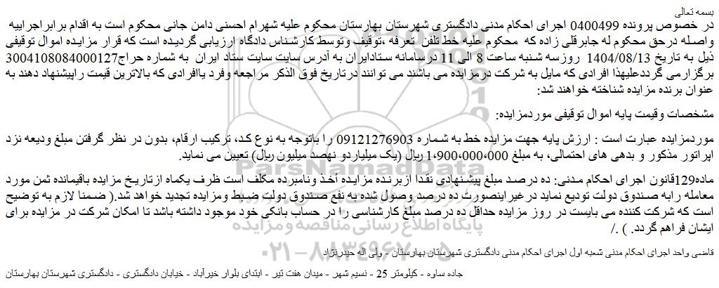 در خصوص پرونده 0400499 اجرای احکام مدنی دادگستری شهرستان بهارستان محکوم علیه شهرام احسنی دامن جانی محکوم است به اقدام برابراجراییه  واصله درحق محکوم له جابرقلی زاده که  محکوم علیه خط تلفن  تعرفه ،توقیف وتوسط کارشناس دادگاه ارزیابی گردیده است که قرار مزایده اموال توقیفی ذیل به تاریخ 1404/08/13  روزسه شنبه ساعت 8 الی 11 درسامانه ستادایران به آدرس سایت سایت ستاد ایران  به شماره حراج3004108084000127 برگزارمی گرددعلیهذا افرادی که مایل به شرکت درمزایده می باشند می توانند درتاریخ فوق الذکر مراجعه وفرد یاافرادی که بالاترین قیمت راپیشنهاد دهند به عنوان برنده مزایده شناخته خواهند شد: