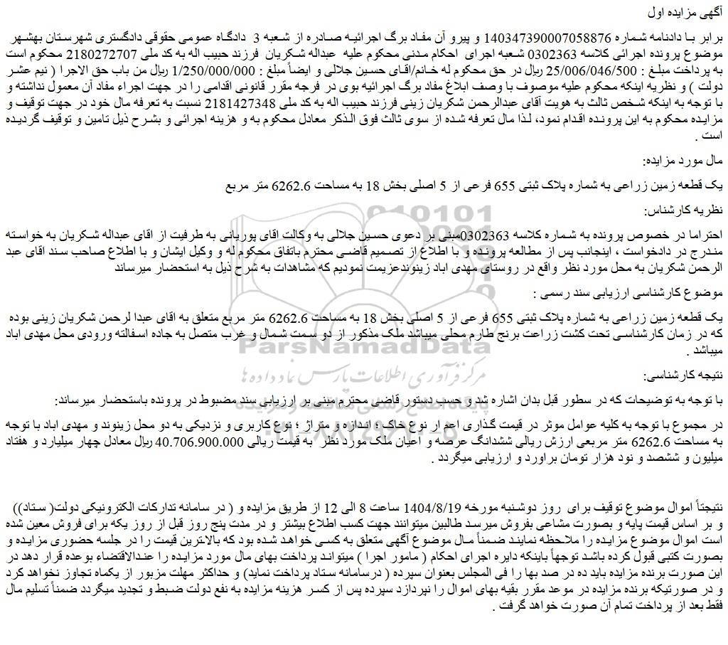 برابر با دادنامه شماره 140347390007058876 و پیرو آن مفاد برگ اجرائیه صادره از شعبه 3 دادگاه عمومی حقوقی دادگستری شهرستان بهشهر موضوع پرونده اجرائی کلاسه 0302363 شعبه اجرای احکام مدنی محکوم علیه عبداله شکریان فرزند حبیب اله به کد ملی 2180272707 محکوم است به پرداخت مبلغ : 25/006/046/500 ریال در حق محکوم له خانم/اقای حسین جلالی و ایضاً مبلغ : 1/250/000/000 ریال من باب حق الاجرا ( نیم عشر دولت ) و نظریه اینکه محکوم علیه موصوف با وصف ابلاغ مفاد برگ اجرائیه بوی در فرجه مقرر قانونی اقدامی را در جهت اجراء مفاد آن معمول نداشته و با توجه به اینکه شخص ثالث به هویت آقای عبدالرحمن شکریان زینی فرزند حبیب اله به کد ملی 2181427348 نسبت به تعرفه مال خود در جهت توقیف و مزایده محکوم به این پرونده اقدام نمود، لذا مال تعرفه شده از سوی ثالث فوق الذکر معادل محکوم به و هزینه اجرائی و بشرح ذیل تامین و توقیف گردیده است .