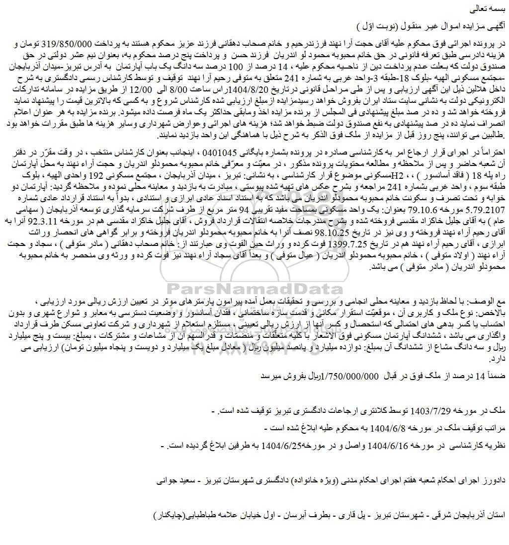 در پرونده اجرائی فوق محکوم علیه آقای حجت آرا نهند فرزندرحیم و خانم صحاب دهقانی فرزند عزیز محکوم هستند به پرداخت 319/850/000 تومان و هزینه دادرسی طبق تعرفه فانونی در حق خانم محبوبه محمود لو اندریان فرزند حسن و پرداخت پنج درصد محکوم به، بعنوان نیم عشر دولتی در حق صندوق دولت که بـعلت عـدم پرداخـت دین از ناحــیه محکوم علیه ، 14 درصد از 100 درصد سه دانگ یک باب آپارتمان به آدرس تبریز-میدان آذربایجان -مجتمع مسکونی الهیه -بلوک 18-طبقه 3-واحد غربی به شماره 241 متعلق به متوفی رحیم آرا نهند توقیف و توسط کارشناس رسمی دادگستری به شرح داخل هلالین ذیل این آگهی ارزیابی و پس از طی مـراحـل قانونی درتاریخ 1404/8/20راس ساعت 8/00 الی 12/00 از طریق مزایده در سامانه تدارکات الکترونیکی دولت به نشانی سایت ستاد ایران بفروش خواهد رسیدمزایده ازمبلغ ارزیابی شده کارشناس شروع و به کسی که بالاترین قیمت را پیشنهاد نماید فروخته خواهد شد و ده در صد مبلغ پیشنهادی فی المجلس از برنده مزایده اخذ ومابقی حداکثر یک ماه فرصت داده میشود. برنده مزایده به هر عنوان اعلام انصراف نماید ده در صد پیشنهادی به نفع صندوق دولت ضبط خواهد شد؛ هزینه های اجرائی وعوارض شهرداری وسایر هزینه ها طبق مقررات خواهد بود .طالبین می توانند، پنج روز قبل از مزایده از ملک فوق الذکر به شرح ذیل با هماهنگی این واحد بازدید نمایند.