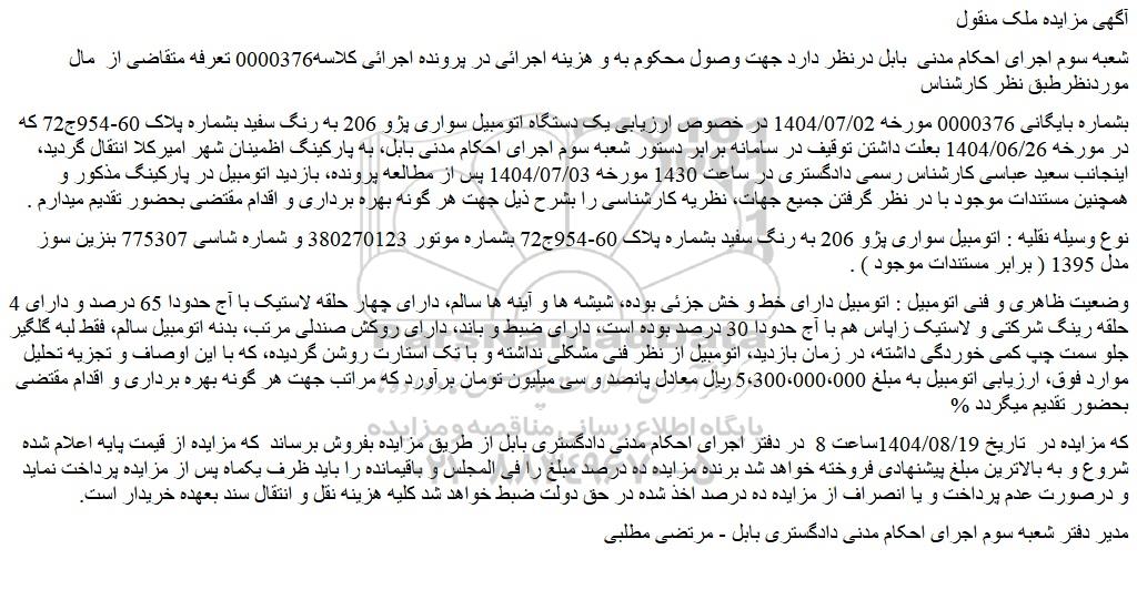 بشماره بایگانی 0000376 مورخه 1404/07/02 در خصوص ارزیابی یک دستگاه اتومبیل سواری پژو 206 به رنگ سفید بشماره پلاک 60-954ج72 که در مورخه 1404/06/26 بعلت داشتن توقیف در سامانه برابر دستور شعبه سوم اجرای احکام مدنی بابل، به پارکینگ اظمینان شهر امیرکلا انتقال گردید، اینجانب سعید عباسی کارشناس رسمی دادگستری در ساعت 1430 مورخه 1404/07/03 پس از مطالعه پرونده، بازدید اتومبیل در پارکینگ مذکور و همچنین مستندات موجود با در نظر گرفتن جمیع جهات، نظریه کارشناسی را بشرح ذیل جهت هر گونه بهره برداری و اقدام مقتضی بحضور تقدیم میدارم .