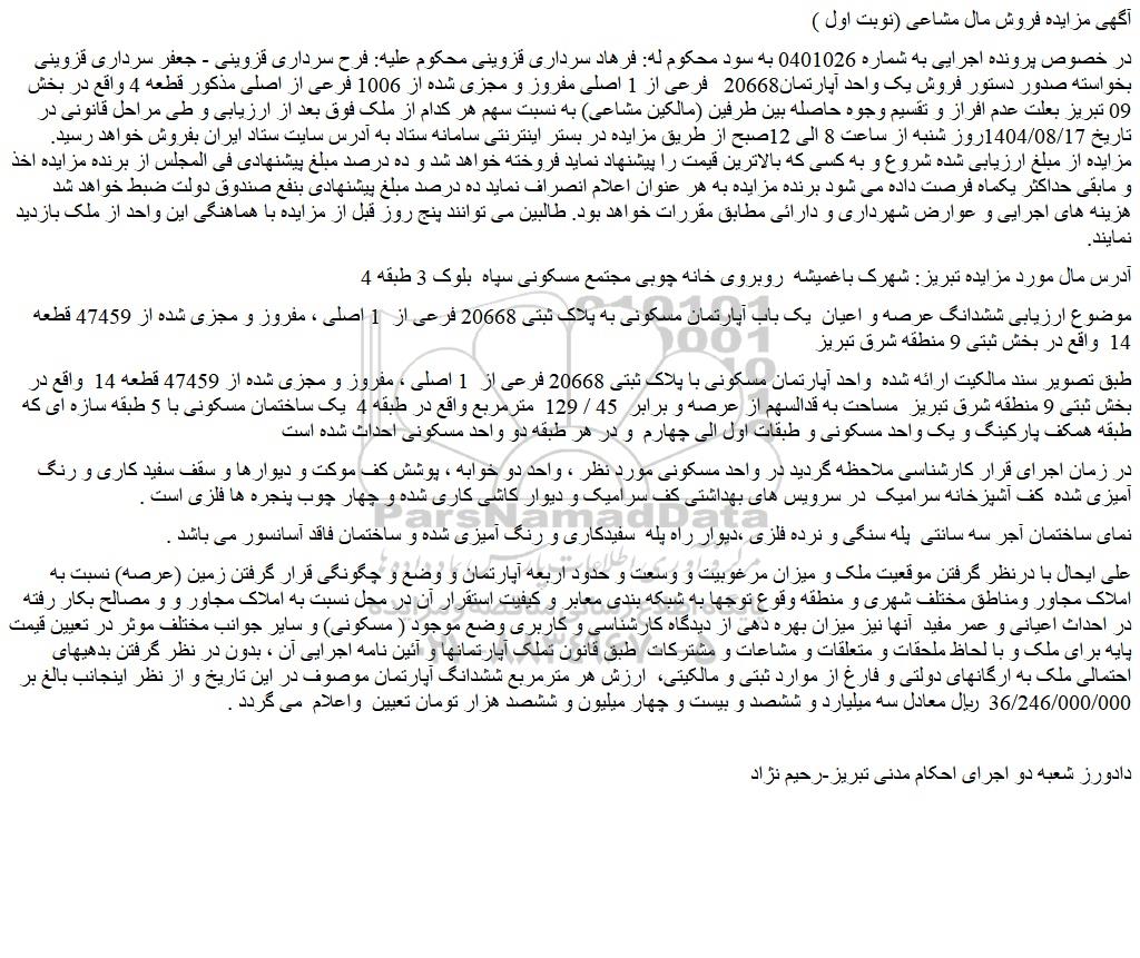 در خصوص پرونده اجرایی به شماره 0401026 به سود محکوم له: فرهاد سرداری قزوینی محکوم علیه: فرح سرداری قزوینی - جعفر سرداری قزوینی بخواسته صدور دستور فروش یک واحد آپارتمان20668   فرعی از 1 اصلی مفروز و مجزی شده از 1006 فرعی از اصلی مذکور قطعه 4 واقع در بخش 09 تبریز بعلت عدم افراز و تقسیم وجوه حاصله بین طرفین (مالکین مشاعی) به نسبت سهم هر کدام از ملک فوق بعد از ارزیابی و طی مراحل قانونی در تاریخ 1404/08/17روز شنبه از ساعت 8 الی 12صبح از طریق مزایده در بستر اینترنتی سامانه ستاد به آدرس سایت ستاد ایران بفروش خواهد رسید. مزایده از مبلغ ارزیابی شده شروع و به کسی که بالاترین قیمت را پیشنهاد نماید فروخته خواهد شد و ده درصد مبلغ پیشنهادی فی المجلس از برنده مزایده اخذ و مابقی حداکثر یکماه فرصت داده می شود برنده مزایده به هر عنوان اعلام انصراف نماید ده درصد مبلغ پیشنهادی بنفع صندوق دولت ضبط خواهد شد هزینه های اجرایی و عوارض شهرداری و دارائی مطابق مقررات خواهد بود. طالبین می توانند پنج روز قبل از مزایده با هماهنگی این واحد از ملک بازدید نمایند.