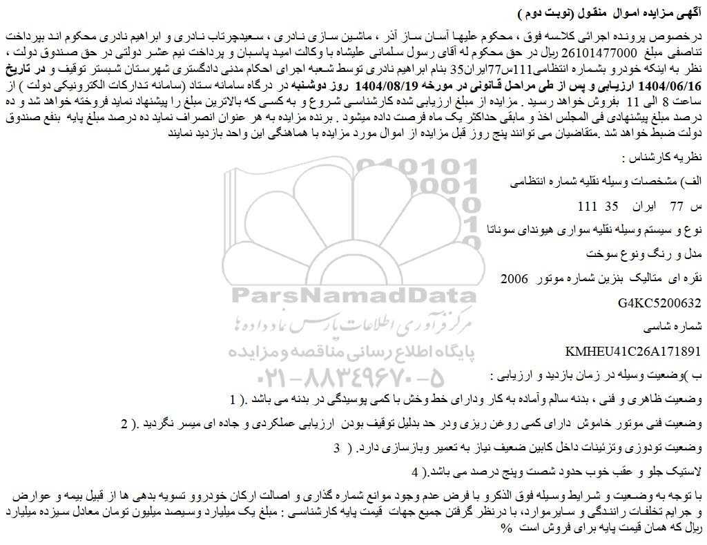 درخصوص پرونده اجرائی کلاسه فوق ، محکوم علیها آسان ساز آذر ، ماشین سازی نادری ، سعیدچرتاب نادری و ابراهیم نادری محکوم اند بپرداخت تناصفی مبلغ 26101477000 ریال در حق محکوم له آقای رسول سلمانی علیشاه با وکالت امید پاسبان و پرداخت نیم عشر دولتی در حق صندوق دولت ، نظر به اینکه خودرو بشماره انتظامی111س77ایران35 بنام ابراهیم نادری توسط شعبه اجرای احکام مدنی دادگستری شهرستان شبستر توقیف و در تاریخ 1404/06/16 ارزیابی و پس از طی مراحل قانونی در مورخه 1404/08/19 روز دوشنبه در درگاه سامانه ستاد (سامانه تدارکات الکترونیکی دولت ) از ساعت 8 الی 11 بفروش خواهد رسید . مزایده از مبلغ ارزیابی شده کارشناسی شروع و به کسی که بالاترین مبلغ را پیشنهاد نماید فروخته خواهد شد و ده درصد مبلغ پیشنهادی فی المجلس اخذ و مابقی حداکثر یک ماه فرصت داده میشود . برنده مزایده به هر عنوان انصراف نماید ده درصد مبلغ پایه بنفع صندوق دولت ضبط خواهد شد .متقاضیان می توانند پنج روز قبل مزایده از اموال مورد مزایده با هماهنگی این واحد بازدید نمایند