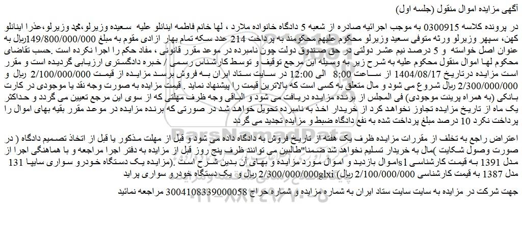 در پرونده کلاسه 0300915 به موجب اجرائیه صادره از شعبه 5 دادگاه خانواده ملارد ، لها خانم فاطمه اینانلو علیه  سعیده وزیرلو،محمد وزیرلو،عذرا اینانلو کهن، سپهر وزیرلو ورثه متوفی سعید وزیرلو محکوم علیهم محکومند به پرداخت 214 عدد سکه تمام بهار ازادی مقوم به مبلغ 149/800/000/000ریال به عنوان اصل خواسته  و 5 درصد نیم عشر دولتی در حق صندوق دولت چون نامبرده در موعد مقرر قانونی ، مفاد حکم را اجرا نکرده است .حسب تقاضای محکوم لها اموال منقول محکوم علیه به شرح زیر به وسیله این مرجع توقیف و توسط کارشناس رسمی / خبره دادگستری ارزیابی گردیده است و مقرر است مزایده درتاریخ 1404/08/17 از ساعت 8:00 الی 12:00 در سایت ستاد ایران به فروش برسد مزایده از قیمت 2/100/000/000 ریال و 2/300/000/000 ریال شروع می شود و مال متعلق به کسی است که بالاترین قیمت را پیشنهاد نماید . قیمت مزایده به صورت وجه نقد یا موجودی در کارت بانکی (به همراه پرینت موجودی) فی المجلس از برنده مزایده دریافت می شود و الباقی وجه ظرف مهلتی که از سوی این مرجع تعیین می گردد و حداکثر یک ماه از تاریخ مزایده تجاوز نخواهد کرد از خریدار اخذ به نامبرده تحویل خواهد شد در صورتی که برنده مزایده در موعد مقرر بقیه بهای اموال را پرداخت نکرد 10 درصد مبلغ پرداخت شده به نفع دادگاه ضبط و مزایده تجدید می گردد