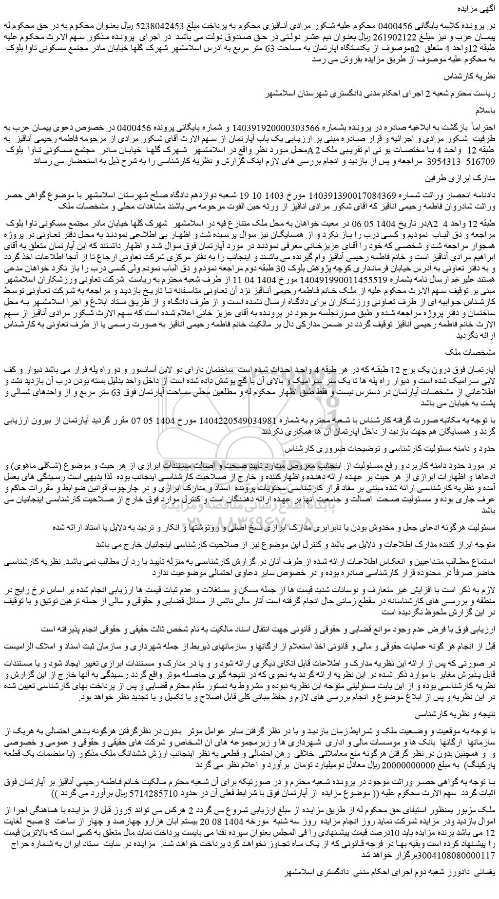 در پرونده کلاسه بایگانی 0400456 محکوم علیه شکور مرادی آناقیزی محکوم به پرداخت مبلغ 5238042453 ریال بعنوان محکوم به در حق محکوم له پیمان عرب و نیز مبلغ 261902122 ریال بعنوان نیم عشر دولتی در حق صندوق دولت می باشد در اجرای پرونده مذکور سهم الارث محکوم علیه موصوف از یکدستگاه اپارتمان به مساحت 63 متر مربع به ادرس اسلامشهر شهرک گلها خیابان مادر مجتمع مسکونی تاوا بلوک a2 طبقه 12واحد 4 متعلق به محکوم علیه موصوف از طریق مزایده بفروش می رسد