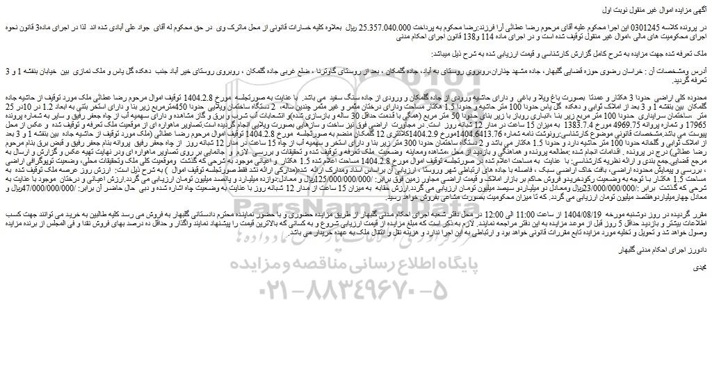 مقرر گردیده در روز دوشنبه مورخه 1404/08/19 از ساعت 11:00 الی 12:00 در محل دفتر شعبه اجرای احکام مدنی گلبهار از طریق مزایده حضوری و با حضور نماینده محترم دادستانی گلبهار به فروش می رسد کلیه طالبین به خرید می توانند جهت کسب اطلاعات بیشتر و بازدید حداقل 5 روز قبل از موعد مزایده به این دفتر مراجعه نمایند. لازم به ذکر است که مبلغ مزایده از قیمت ارزیابی شروع و به کسانی که بالاترین قیمت را پیشنهاد نمایند واگذار و حداقل ده درصد بهای فروش نقدا و فی المجلس از برنده مزایده وصول خواهد شد و تحویل و تخلیه مورد مزایده تابع مقررات قانونی خواهد بود و ارتباطی به این اجرا ندارد و هزینه نقل و انتقال ملک به عهده خریدار می باشد.