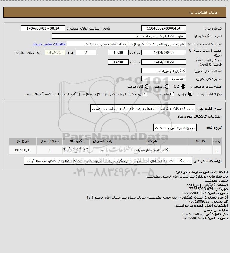شرح کلی نیاز: ست گان کلاه و شلوار اتاق عمل و چند قلم دیگر طبق لیست پیوست