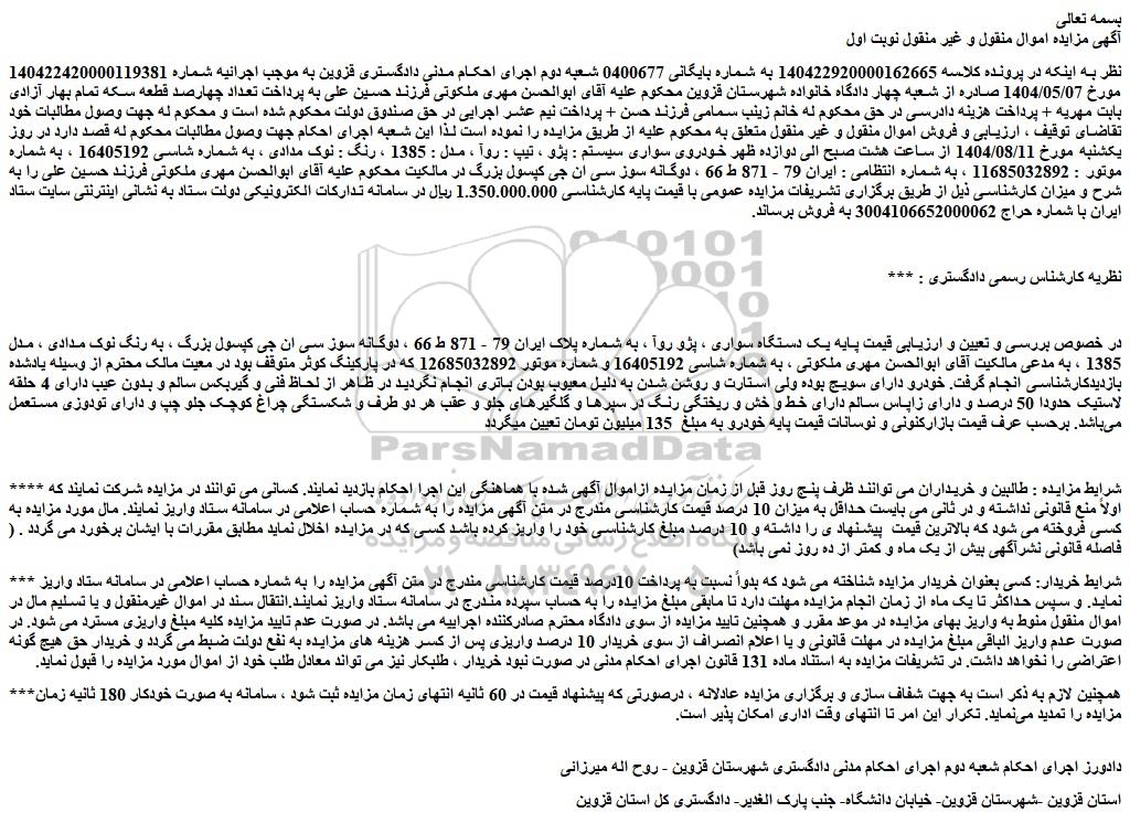 نظر به اینکه در پرونده کلاسه 140422920000162665 به شماره بایگانی 0400677 شعبه دوم اجرای احکام مدنی دادگستری قزوین به موجب اجرائیه شماره 140422420000119381 مورخ 1404/05/07 صادره از شعبه چهار دادگاه خانواده شهرستان قزوین محکوم علیه آقای ابوالحسن مهری ملکوتی فرزند حسین علی به پرداخت تعداد چهارصد قطعه سکه تمام بهار آزادی بابت مهریه + پرداخت هزینه دادرسی در حق محکوم له خانم زینب سمامی فرزند حسن + پرداخت نیم عشر اجرایی در حق صندوق دولت محکوم شده است و محکوم له جهت وصول مطالبات خود تقاضای توقیف ، ارزیابی و فروش اموال منقول و غیر منقول متعلق به محکوم علیه از طریق مزایده را نموده است لذا این شعبه اجرای احکام جهت وصول مطالبات محکوم له قصد دارد در روز یکشنبه مورخ 1404/08/11 از ساعت هشت صبح الی دوازده ظهر خودروی سواری سیستم : پژو ، تیپ : روآ ، مدل : 1385 ، رنگ : نوک مدادی ، به شماره شاسی 16405192 ، به شماره موتور : 11685032892 ، به شماره انتظامی : ایران 79 - 871 ط 66 ، دوگانه سوز سی ان جی کپسول بزرگ در مالکیت محکوم علیه آقای ابوالحسن مهری ملکوتی فرزند حسین علی را به شرح و میزان کارشناسی ذیل از طریق برگزاری تشریفات مزایده عمومی با قیمت پایه کارشناسی 1.350.000.000 ریال در سامانه تدارکات الکترونیکی دولت ستاد به نشانی اینترنتی سایت ستاد ایران با شماره حراج 3004106652000062 به فروش برساند.