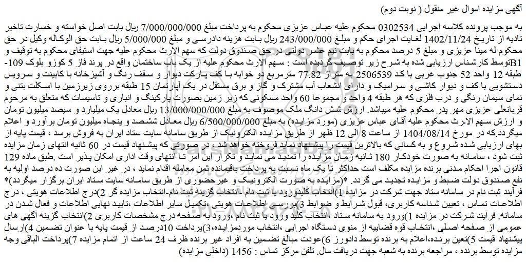 به موجب پرونده کلاسه اجرایی 0302534 محکوم علیه عباس عزیزی محکوم به پرداخت مبلغ 7/000/000/000 ریال بابت اصل خواسته و خسارت تاخیر تادیه از تاریخ 1402/11/24 لغایت اجرای حکم و مبلغ 243/000/000 ریال بابت هزینه دادرسی و مبلغ 5/000/000 ریال بابت حق الوکاله وکیل در حق محکوم له مینا عزیزی و مبلغ 5 درصد محکوم به بابت نیم عشر دولتی در حق صندوق دولت که سهم الارث محکوم علیه جهت استیفای محکوم به توقیف و توسط کارشناس ارزیابی شده به شرح زیر توصیف گردیده است : سهم الارث محکوم علیه از یک باب ساختمان واقع در پرند فاز 5 کوزو بلوک 109-b1 طبقه 12 واحد 52 جنوب غربی با کد 2506539 به متراژ 77.82 مترمربع دو خوابه با کف پارکت دیوار و سقف رنگ و آشپزخانه با کابینت و سرویس دستشویی با کف و دیوار کاشی و سرامیک و دارای انشعاب آب مشترک و گاز و برق مستقل در یک آپارتمان 15 طبقه برروی زیرزمین با اسکلت بتنی و نمای سیمان رنگی و درب فلزی که هر طبقه 4 واحد و مجموعا 60 واحد مسکونی که زیر زمین بصورت پارکینگ و انباری و تاسیسات که متعلق به مرحوم قربانعلی عزیزی مهر پدر محکوم علیه میباشد. ارزش شش دانگ ملک موصوف به مبلغ 13/000/000/000 ریال معادل یک میلیارد و سیصد میلیون تومان و ارزش سهم الارث محکوم علیه آقای عباس عزیزی (مورد مزایده) به مبلغ 6/500/000/000 ریال معادل ششصد و پنجاه میلیون تومان برآورد و اعلام میگردد.که در مورخ 1404/08/14 از ساعت 8 الی 12 ظهر از طریق مزایده الکترونیک از طریق سامانه سایت ستاد ایران به فروش برسد ، قیمت پایه از بهای ارزیابی شده شروع و به کسانی که بالاترین قیمت را پیشنهاد نماید فروخته خواهد شد ، در صورتی که پیشنهاد قیمت در 60 ثانیه انتهای زمان مزایده ثبت شود ، سامانه به صورت خودکار 180 ثانیه زمان مزایده را تمدید می نماید و تکرار این امر تا انتهای وقت اداری امکان پذیر است .طبق ماده 129 قانون اجرا احکام مدنی برنده مزایده مکلف است حداکثر تا یک ماه نسبت به پرداخت باقیمانده ثمن معامله اقدام نماید ، در غیر این صورت ده درصد اولیه به نفع صندوق دولت ضبط و مزایده تجدید می گردد. *(مزایده به صورت الکترونیک و غیرحضوری از طریق سامانه سایت ستاد ایران برگزار میگردد)* فرآیند ثبت نام در سامانه ستاد جهت شرکت در مزایده 1)انتخاب کلیدورود یا ثبت نام -انتخاب گزینه ثبت نام-انتخاب مزایده گر 2)درج اطلاعات هویتی ، درج اطلاعات تماس ، تعیین شناسه کاربری، قبول شرایط و ضوابط 3)بررسی اطلاعات هویتی ،تکمیل سایر اطلاعات ،تایید نهایی اطلاعات و فعال شدن در سامانه. فرآیند شرکت در مزایده 1)ورود به سامانه ستاد ،انتخاب کلید ورود یا ثبت نام ،ورود به صفحه درج مشخصات کاربری 2)انتخاب گزینه آگهی های عمومی از صفحه اصلی ،انتخاب قوه قضاییه از منوی دستگاه اجرایی ،انتخاب موردمزایده،3)پرداخت 10درصد از قیمت پایه با عنوان تضمین 4)ارسال پیشنهاد قیمت 5)تعین برنده،اعلام به برنده توسط دادورز 6)عودت مبالغ تضمین به افراد غیر برنده ظرف 24 ساعت از اتمام مزایده 7)پرداخت الباقی وجه مزایده توسط برنده ، مراجعه برنده به شعبه جهت دریافت مال. تلفن مرکز تماس : 1456 (داخلی مزایده)