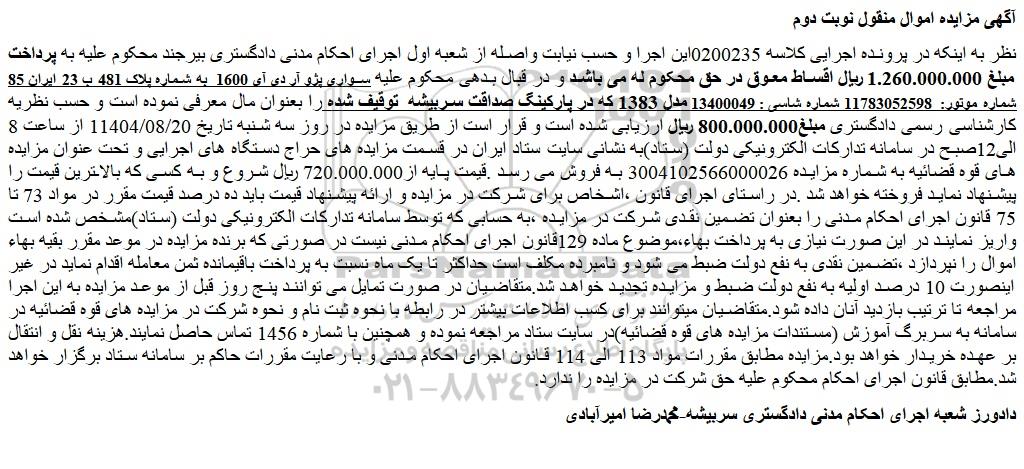 نظر به اینکه در پرونده اجرایی کلاسه 0200235این اجرا و حسب نیابت واصله از شعبه اول اجرای احکام مدنی دادگستری بیرجند محکوم علیه به پرداخت مبلغ 1.260.000.000 ریال اقساط معوق در حق محکوم له می باشد و در قبال بدهی محکوم علیه سواری پژو آر دی آی 1600 به شماره پلاک 481 ب 23 ایران 85 شماره موتور: 11783052598 شماره شاسی : 13400049 مدل 1383 که در پارکینگ صداقت سربیشه توقیف شده را بعنوان مال معرفی نموده است و حسب نظریه کارشناسی رسمی دادگستری مبلغ800.000.000 ریال ارزیابی شده است و قرار است از طریق مزایده در روز سه شنبه تاریخ 11404/08/20 از ساعت 8 الی12صبح در سامانه تدارکات الکترونیکی دولت (ستاد)به نشانی سایت ستاد ایران در قسمت مزایده های حراج دستگاه های اجرایی و تحت عنوان مزایده های قوه قضائیه به شماره مزایده 3004102566000026 به فروش می رسد .قیمت پایه از720.000.000 ریال شروع و به کسی که بالاترین قیمت را پیشنهاد نماید فروخته خواهد شد .در راستای اجرای قانون ،اشخاص برای شرکت در مزایده و ارائه پیشنهاد قیمت باید ده درصد قیمت مقرر در مواد 73 تا 75 قانون اجرای احکام مدنی را بعنوان تضمین نقدی شرکت در مزایده ،به حسابی که توسط سامانه تدارکات الکترونیکی دولت (ستاد)مشخص شده است واریز نمایند در این صورت نیازی به پرداخت بهاء،موضوع ماده 129قانون اجرای احکام مدنی نیست در صورتی که برنده مزایده در موعد مقرر بقیه بهاء اموال را نپردازد ،تضمین نقدی به نفع دولت ضبط می شود و نامبرده مکلف است حداکثر تا یک ماه نسبت به پرداخت باقیمانده ثمن معامله اقدام نماید در غیر اینصورت 10 درصد اولیه به نفع دولت ضبط و مزایده تجدید خواهد شد.متقاضیان در صورت تمایل می توانند پنج روز قبل از موعد مزایده به این اجرا مراجعه تا ترتیب بازدید آنان داده شود.متقاضیان میتوانند برای کسب اطلاعات بیشتر در رابطه با نحوه ثبت نام و نحوه شرکت در مزایده های قوه قضائیه در سامانه به سربرگ آموزش (مستندات مزایده های قوه قضائیه)در سایت ستاد مراجعه نموده و همچنین با شماره 1456 تماس حاصل نمایند.هزینه نقل و انتقال بر عهده خریدار خواهد بود.مزایده مطابق مقررات مواد 113 الی 114 قانون اجرای احکام مدنی و با رعایت مقررات حاکم بر سامانه ستاد برگزار خواهد شد.مطابق قانون اجرای احکام محکوم علیه حق شرکت در مزایده را ندارد.
