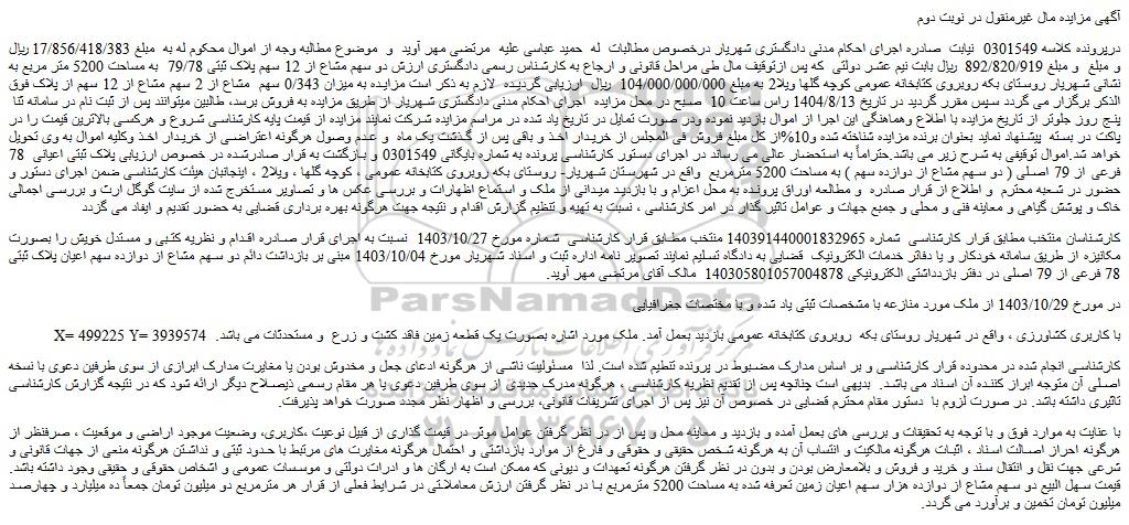 درپرونده کلاسه 0301549 نیابت صادره اجرای احکام مدنی دادگستری شهریار درخصوص مطالبات له حمید عباسی علیه مرتضی مهر آوید و موضوع مطالبه وجه از اموال محکوم له به مبلغ 17/856/418/383 ریال و مبلغ و مبلغ 892/820/919 ریال بابت نیم عشر دولتی که پس ازتوقیف مال طی مراحل قانونی و ارجاع به کارشناس رسمی دادگستری ارزش دو سهم مشاع از 12 سهم پلاک ثبتی 79/78 به مساحت 5200 متر مربع به نشانی شهریار روستای بکه روبروی کتابخانه عمومی کوچه گلها ویلا2 به مبلغ 104/000/000/000 ریال ارزیابی گردیده لازم به ذکر است مزایده به میزان 0/343 سهم مشاع از 2 سهم مشاع از 12 سهم از پلاک فوق الذکر برگزار می گردد سپس مقرر گردید در تاریخ 1404/8/13 راس ساعت 10 صبح در محل مزایده اجرای احکام مدنی دادگستری شهریار از طریق مزایده به فروش برسد، طالبین میتوانند پس از ثبت نام در سامانه ثنا پنج روز جلوتر از تاریخ مزایده با اطلاع وهماهنگی این اجرا از اموال بازدید نموده ودر صورت تمایل در تاریخ یاد شده در مراسم مزایده شرکت نمایند مزایده از قیمت پایه کارشناسی شروع و هرکسی بالاترین قیمت را در پاکت در بسته پیشنهاد نماید بعنوان برنده مزایده شناخته شده و10%از کل مبلغ فروش فی المجلس از خریدار اخذ و باقی پس از گذشت یک ماه و عدم وصول هرگونه اعتراضی از خریدار اخذ وکلیه اموال به وی تحویل خواهد شد.اموال توقیفی به شرح زیر می باشد.حتراماً به استحضار عالی می رساند در اجرای دستور کارشناسی پرونده به شماره بایگانی 0301549 و بازگشت به قرار صادرشده در خصوص ارزیابی پلاک ثبتی اعیانی 78 فرعی از 79 اصلی ( دو سهم مشاع از دوازده سهم ) به مساحت 5200 مترمربع واقع در شهرستان شهریار- روستای بکه روبروی کتابخانه عمومی ، کوچه گلها ، ویلا2 ، اینجانبان هیئت کارشناسی ضمن اجرای دستور و حضور در شعبه محترم و اطلاع از قرار صادره و مطالعه اوراق پرونده به محل اعزام و با بازدید میدانی از ملک و استماع اظهارات و بررسی عکس ها و تصاویر مستخرج شده از سایت گوگل ارث و بررسی اجمالی خاک و پوشش گیاهی و معاینه فنی و محلی و جمبع جهات و عوامل تاثیر گذار در امر کارشناسی ، نسبت به تهیه و تنظیم گزارش اقدام و نتیجه جهت هرگونه بهره برداری قضایی به حضور تقدیم و ایفاد می گزدد