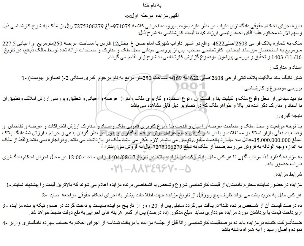 دایره اجرای احکام حقوقی دادگستری داراب در نظر دارد بموجب پرونده اجرایی کلاسه 971075مبلغ 7275306279 ریال از ملک به شرح کارشناسی ذیل وسهم الارث محکوم علیه آقای احمد رئیسی فرزند محمد با قیمت کارشناسی به شرح ذیل: