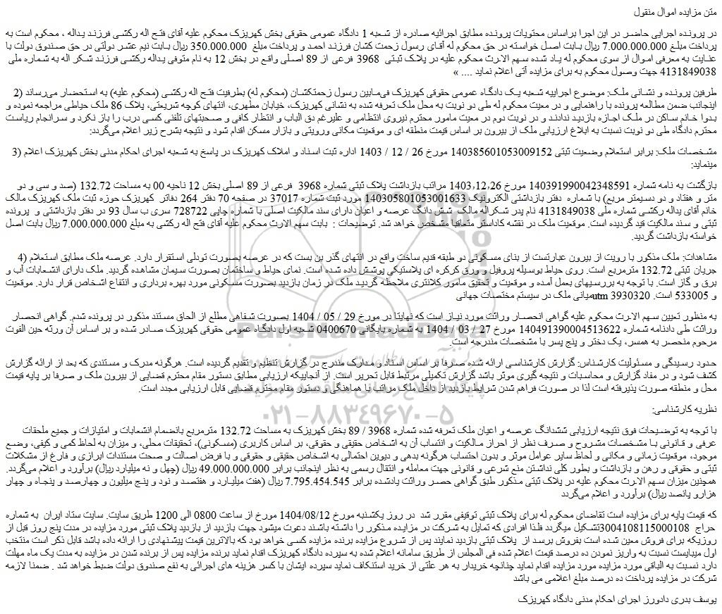 در پرونده اجرایی حاضر در این اجرا براساس محتویات پرونده مطابق اجرائیه صادره از شعبه 1 دادگاه عمومی حقوقی بخش کهریزک محکوم علیه آقای فتح اله رکشی فرزند یداله ، محکوم است به پرداخت مبلغ 7.000.000.000 ریال بابت اصل خواسته در حق محکوم له آقای رسول زحمت کشان فرزند احمد و پرداخت مبلغ 350.000.000 ریال بابت نیم عشر دولتی در حق صندوق دولت با عنایت به معرفی اموال از سوی محکوم له یاد شده سهم الارث محکوم علیه در پلاک ثبتی 3968 فرعی از 89 اصلی واقع در بخش 12 به نام متوفی یداله رکشی فرزند شکر اله به شماره ملی 4131849038 جهت وصول محکوم به برای مزایده آتی اعلام نماید .... »