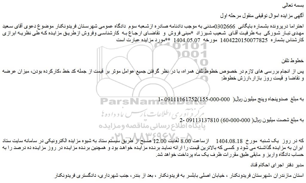 احتراما درپرونده بشماره بایگانی  0302666مدنی به موجب دادنامه صادره ازشعبه سوم  دادگاه عمومی شهرستان فریدونکنار موضوع دعوی آقای سعید مهدی تبار شورکی  به طرفیت آقای  شعیب شیرزاد  *مبنی فروش  و  تقاضای ارجاع به  کارشناسی وفروش ازطریق مزایده که طی نظریه ابرازی کارشناس بشماره  1404220150077825  مورخه  1404.05.07  **مورد مزایده عبارت است