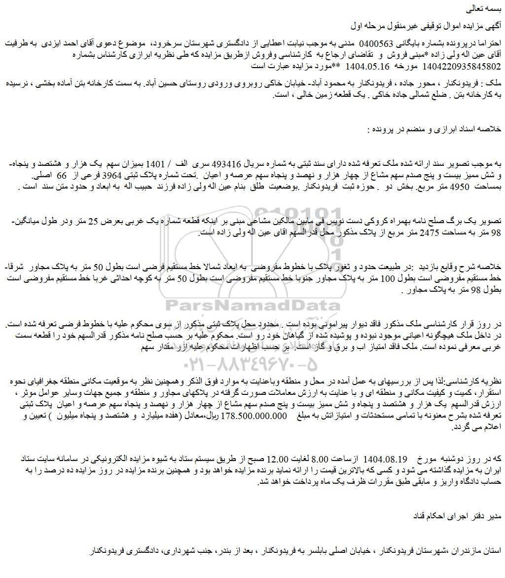 احتراما درپرونده بشماره بایگانی 0400563 مدنی به موجب نیابت اعطایی از دادگستری شهرستان سرخرود، موضوع دعوی آقای احمد ایزدی به طرفیت آقای عین اله ولی زاده *مبنی فروش و تقاضای ارجاع به کارشناسی وفروش ازطریق مزایده که طی نظریه ابرازی کارشناس بشماره 1404220935845802 مورخه 1404.05.16 **مورد مزایده عبارت است