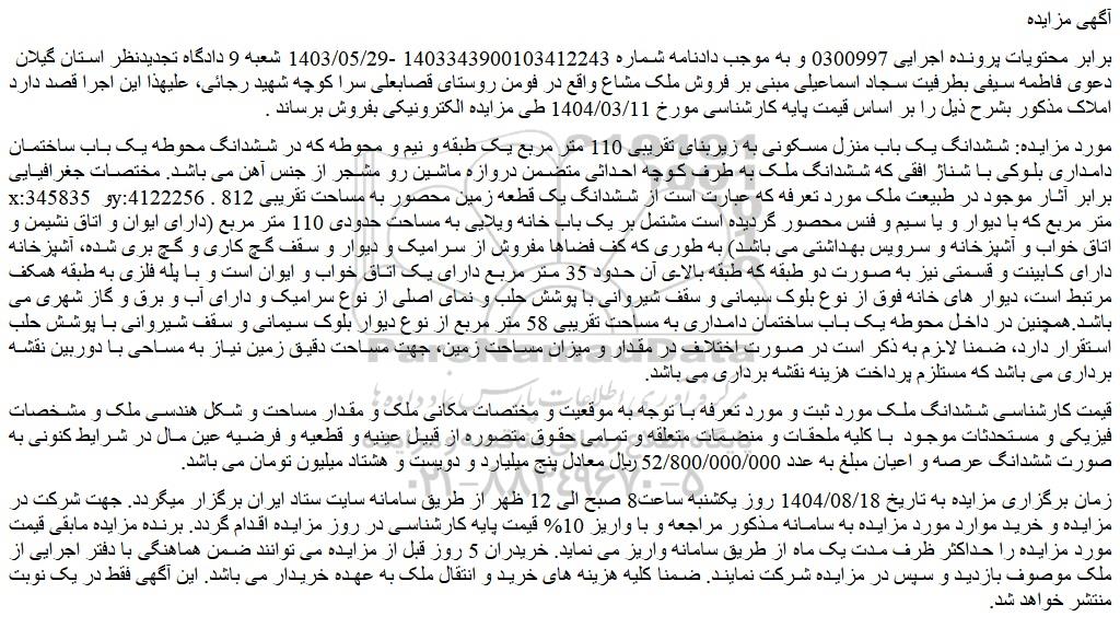 برابر محتویات پرونده اجرایی 0300997 و به موجب دادنامه شماره 1403343900103412243 -1403/05/29 شعبه 9 دادگاه تجدیدنظر استان گیلان دعوی فاطمه سیفی بطرفیت سجاد اسماعیلی مبنی بر فروش ملک مشاع واقع در فومن روستای قصابعلی سرا کوچه شهید رجائی، علیهذا این اجرا قصد دارد املاک مذکور بشرح ذیل را بر اساس قیمت پایه کارشناسی مورخ 1404/03/11 طی مزایده الکترونیکی بفروش برساند .