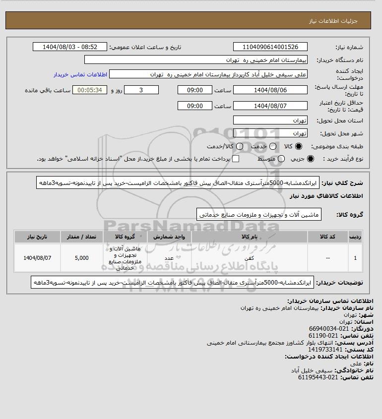 | 1 | -- | کفن | عدد | ماشین آلات و تجهیزات و ملزومات صنایع خدماتی | 5,000 | 1404/08/07 |