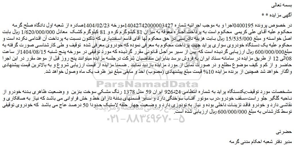 در خصوص پرونده 0400195اجرا و به موجب اجرائیه شماره 14042742000003427مورخه 1404/02/23صادره از شعبه اول دادگاه صلح گرمه محکوم علیه آقای علی کریمی محکوم است به پرداخت اجاره معوقه به میزان 81 کیلوگرم کره و 81 کیلوگرم کشک معادل 1/620/000/000 ریال بابت اصل خواسته و مبلغ 15/535/000 ریال بابت هزینه دادرسی در حق محکوم لها آقای قاسم اسفندیاری که تاکنون نسبت به پرداخت آن اقدامی نکرده است و محکوم علیه یک دستگاه خودروی سواری پراید جهت پرداخت محکوم به معرفی نموده که خودروی معرفی شده توقیف و طی کارشناسی صورت گرفته به مبلغ600/000/000 ریال ارزیابی گردیده است که پس از سیر مراحل قانونی مقرر گردیده که مورد توقیفی در مورخه پنج شنبه 1404/08/15از ساعت 08الی 12 از طریق مزایده در سامانه ستاد ایران به فروش برسد بنابراین متقاضیان شرکت درجلسه مزایده میتوانند پنج روز قبل از موعد مقرر در این اجرا حاضر و از کم و کیف موضوع مطلع و در صورت تمایل از مورد مزایده بازدید نمایند . ضمنا مزایده از قیمت ارزیابی شروع و به بالاترین قیمت پیشنهادی واگذار خواهد شد همچنین از برنده مزایده 10% قیمت مبلغ پیشنهادی (مصوب) اخذ و مابقی مبلغ نیز ظرف یک ماه وصول خواهد شد.
