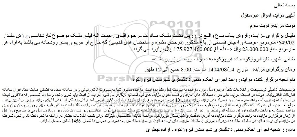 دلیل برگزاری مزایده: فروش یک باغ واقع در زرین دشت ملک ماترک مرحوم آقای رحمت اله فیلم. ملک موضوع کارشناسی ارزش مقدار 7649/02مترمربع عرصه و اعیان قسمتی از باغ مذکور (درختان مثمره و ساختمان های قدیمی) که خارج از حریم و بستر رودخانه می باشد به ازاء هر مترمربع مبلغ 23.000.000 ریال جمعاً مبلغ 175.927.460.000 ریال برآورد می گردد.