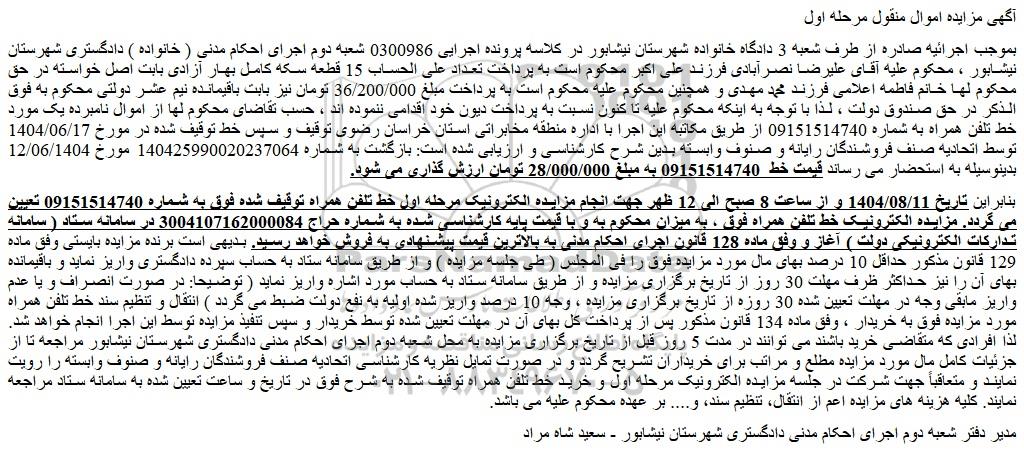 بموجب اجرائیه صادره از طرف شعبه 3 دادگاه خانواده شهرستان نیشابور در کلاسه پرونده اجرایی 0300986 شعبه دوم اجرای احکام مدنی ( خانواده ) دادگستری شهرستان نیشابور ، محکوم علیه آقای علیرضا نصرآبادی فرزند علی اکبر محکوم است به پرداخت تعداد علی الحساب 15 قطعه سکه کامل بهار آزادی بابت اصل خواسته در حق محکوم لها خانم فاطمه اعلامی فرزند محمد مهدی و همچنین محکوم علیه محکوم است به پرداخت مبلغ 36/200/000 تومان نیز بابت باقیمانده نیم عشر دولتی محکوم به فوق الذکر در حق صندوق دولت ، لذا با توجه به اینکه محکوم علیه تا کنون نسبت به پرداخت دیون خود اقدامی ننموده اند ، حسب تقاضای محکوم لها از اموال نامبرده یک مورد خط تلفن همراه به شماره 09151514740 از طریق مکاتبه این اجرا با اداره منطقه مخابراتی استان خراسان رضوی توقیف و سپس خط توقیف شده در مورخ 1404/06/17 توسط اتحادیه صنف فروشندگان رایانه و صنوف وابسته بدین شرح کارشناسی و ارزیابی شده است: بازگشت به شماره 140425990020237064 مورخ 12/06/1404 بدینوسیله به استحضار می رساند قیمت خط 09151514740 به مبلغ 28/000/000 تومان ارزش گذاری می شود.