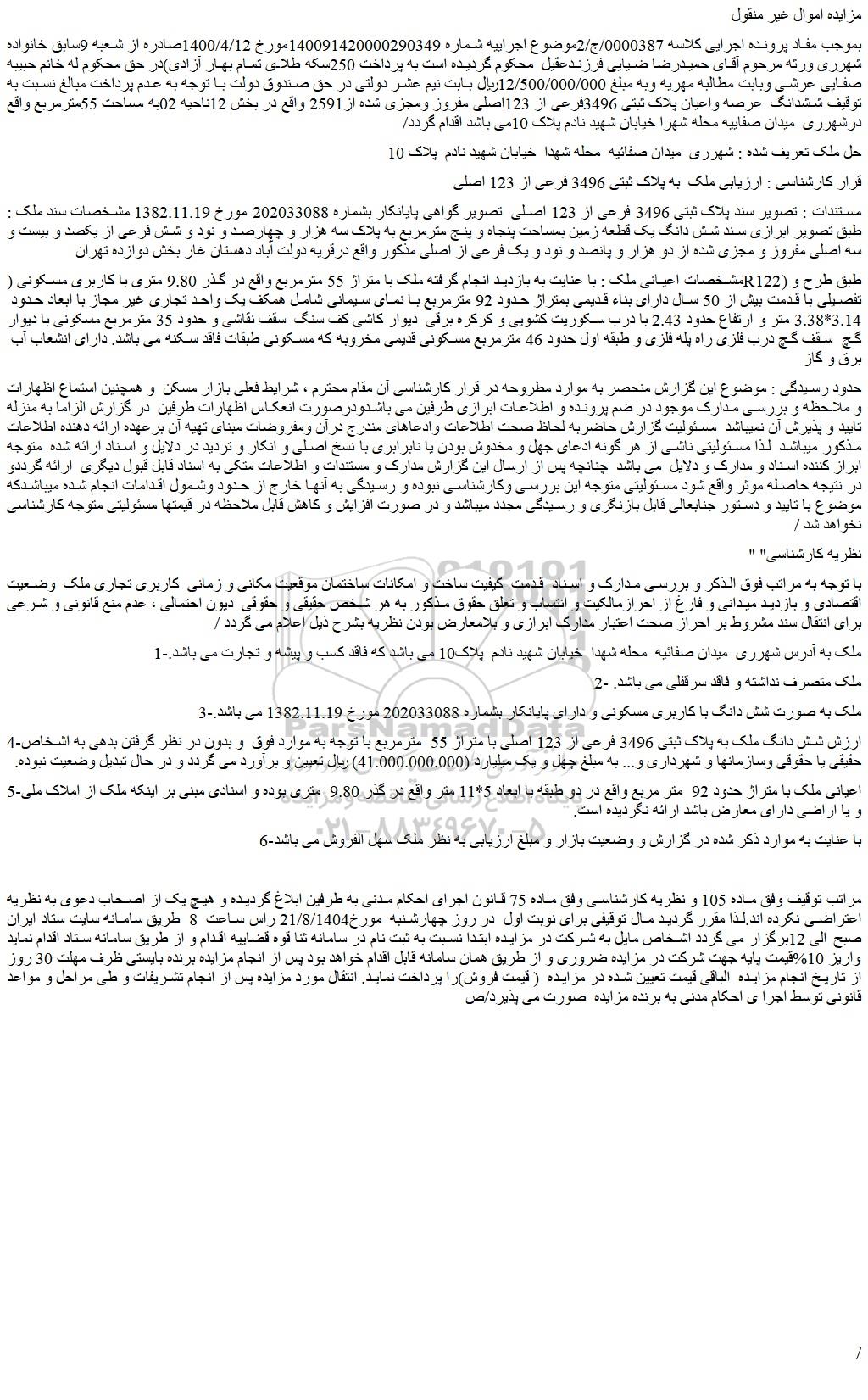 بموجب مفاد پرونده اجرایی کلاسه 0000387/ج/2موضوع اجراییه شماره 140091420000290349مورخ 1400/4/12صادره از شعبه 9سابق خانواده شهرری ورثه مرحوم آقای حمیدرضا ضیایی فرزندعقیل محکوم گردیده است به پرداخت 250سکه طلای تمام بهار آزادی)در حق محکوم له خانم حبیبه صفایی عرشی وبابت مطالبه مهریه وبه مبلغ 12/500/000/000ریال بابت نیم عشر دولتی در حق صندوق دولت با توجه به عدم پرداخت مبالغ نسبت به توقیف ششدانگ عرصه واعیان پلاک ثبتی 3496فرعی از 123اصلی مفروز ومجزی شده از2591 واقع در بخش 12ناحیه 02به مساحت 55مترمربع واقع درشهرری میدان صفاییه محله شهرا خیابان شهید نادم پلاک 10می باشد اقدام گردد/