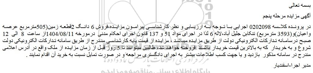 در پرونده کلاسه 0202098 اجرایی با توجه به ارزیابی و نظر کارشناسی پیرامون مزایده،فروش 6 دانگ 2قطعه زمین(505مترمربع عرصه واعیان)و(3593 مترمربع) تنکابن جلیل آباد،لاله 6 لذا در اجرای مواد 51 و 137 قانون اجرای احکام مدنی درمورخه 1404/08/11از ساعت 8 الی 12 صبح درسامانه تدارکات الکترونیکی دولت از طریق مزایده میباشد ، مزایده از قیمت پایه کارشناسی مندرج از طریق سامانه تدارکات الکترونیکی دولت شروع و به خریدار که به بالاترین قیمت خریدار باشند فروخته خواهد شد، طالبین میتوانند تا 5 روز قبل از زمان مزایده از ملک واقع در آدرس اعلامی مندرج در سامانه مذکور بازدید و یا جهت کسب اطلاعات بیشتر به اجرای دادگستری مراجعه و در صورت تمایل نسبت به خرید آن اقدام نمایند .