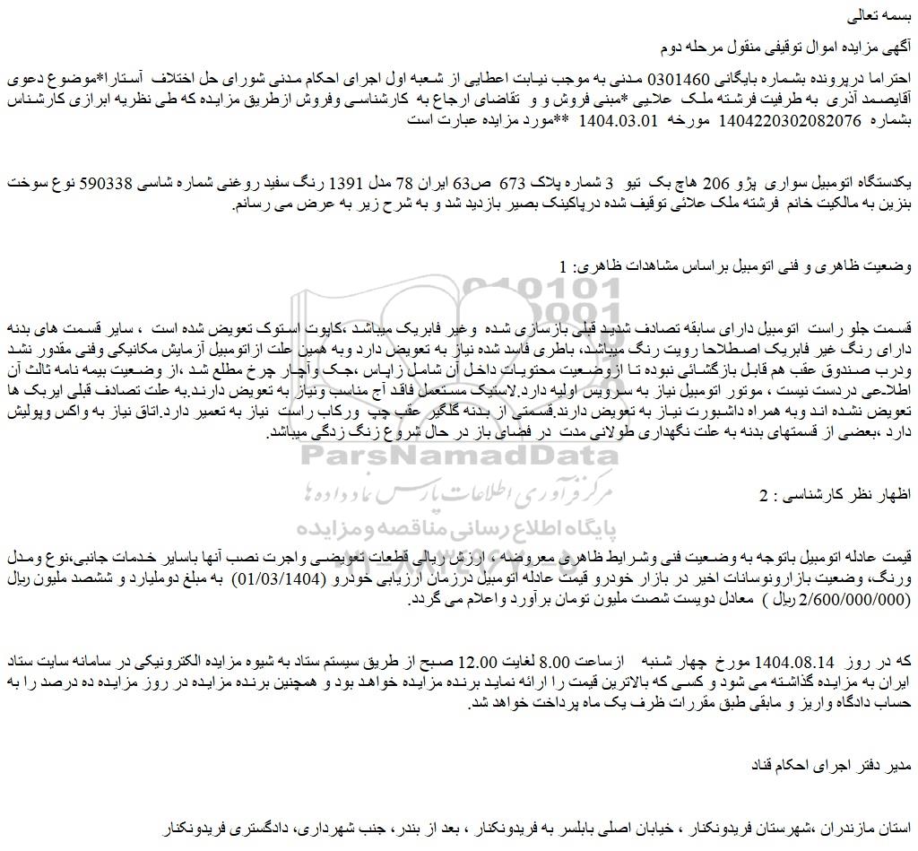 احتراما درپرونده بشماره بایگانی 0301460 مدنی به موجب نیابت اعطایی از شعبه اول اجرای احکام مدنی شورای حل اختلاف آستارا*موضوع دعوی آقایصمد آذری به طرفیت فرشته ملک علایی *مبنی فروش و و تقاضای ارجاع به کارشناسی وفروش ازطریق مزایده که طی نظریه ابرازی کارشناس بشماره 1404220302082076 مورخه 1404.03.01 **مورد مزایده عبارت است