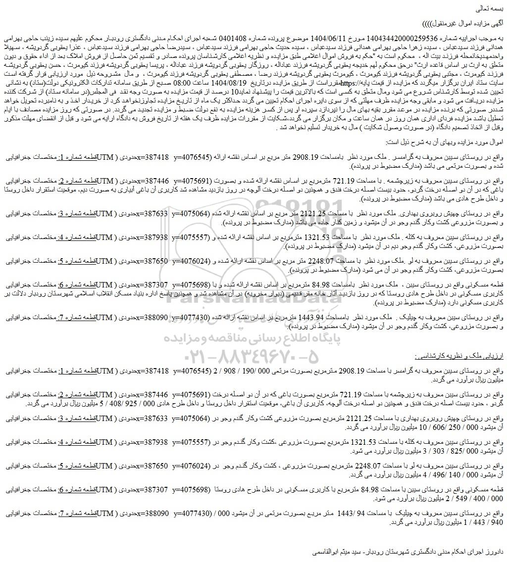 به موجب اجراییه شماره 140434420000259536 مورخ 1404/06/11 موضوع پرونده شماره 0401408 شعبه اجرای احکام مدنی دادگستری رودبار محکوم علیهم سیده زینب حاجی بهرامی همدانی فرزند سیدعباس ، سیده زهرا حاجی بهرامی همدانی فرزند سیدعباس ، سیده حدیث حاجی بهرامی فرزند سیدعباس ، سیدرضا حاجی بهرامی فرزند سیدعباس ، عذرا یعقوبی گردویشه ، سهیلا واحدمهدیخانمحله فرزند بیت اله ، محکوم است به "حکم به فروش اموال اعلامی طبق مزایده و نظریه اعلامی کارشناسان پرونده صادر و تقسیم ثمن حاصل از فروش املاک بعد از اداء حقوق و دیون متعلق به ارث بر اساس قاعده ارث" درحق محکوم لهم خدیجه یعقوبی گردویشه فرزند عباداله ، روزگار یعقوبی گردویشه فرزند عباداله ، پریسا یعقوبی گردویشه فرزند کیومرث ، حسن یعقوبی گردویشه فرزند کیومرث ، مجتبی یعقوبی گردویشه فرزند کیومرث ، کیومرث یعقوبی گردویشه فرزند رضا ، مصطفی یعقوبی گردویشه فرزند کیومرث ، و مال مشروحه ذیل مورد ارزیابی قرار گرفته است مقرراست از طریق مزایده درتاریخ 1404/08/19 ساعت 08:00 صبح از طریق سامانه تدارکات الکترونیکی دولت(ستاد) به نشانی سایت ستاد ایران برگزار میگردد که مزایده از قیمت پایه تعیین شده توسط کارشناس شروع می شود ومال متعلق به کسی است که بالاترین قیمت را پیشنهاد نماید10 درصد از قیمت مزایده به صورت وجه نقد فی المجلس(در سامانه ستاد) از شرکت کننده مزایده دریافت می شود و مابقی وجه مزایده ظرف مهلتی که از سوی دایره اجرای احکام تعیین می گردد حداکثر یک ماه از تاریخ مزایده تجاوزنخواهد کرد از خریدار اخذ و به نامبرده تحویل خواهد شددر صورتی که برنده مزایده در موعد مقرر بقیه بهای مال را نپردازد سپرده او پس از کسر هزینه مزایده به نفع دولت ضبط و مزایده تجدید می گردد. در صورتی که روز مزایده مصادف با ایام تعطیل باشد مزایده فردای اداری همان روز در همان ساعت و مکان برگزار می گردد،شکایت از مقررات مزایده ظرف یک هفته از تاریخ فروش به دادگاه ارایه می شود و قبل از انقضای مهلت مذکور وقبل از اتخاذ تصمیم دادگاه (در صورت وصول شکایت ) مال به خریدار تسلیم نخواهد شد .