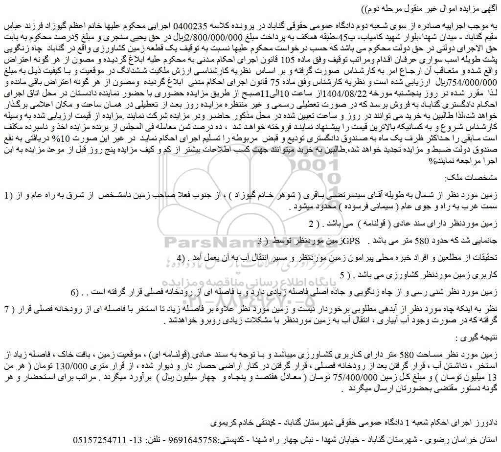 به موجب اجراییه صادره از سوی شعبه دوم دادگاه عمومی حقوقی گناباد در پرونده کلاسه 0400235 اجرایی محکوم علیها خانم اعظم گیوزاد فرزند عباس مقیم گناباد - میدان شهدا-بلوار شهید کامیاب- پ45-طبقه همکف به پرداخت مبلغ 2/800/000/000ریال در حق یحیی سنجری و مبلغ 5درصد محکوم به بابت حق الاجرای دولتی در حق دولت محکوم می باشد که حسب درخواست محکوم علیها نسبت به توقیف یک قطعه زمین کشاورزی واقع در گناباد چاه زنگویی پشت طویله اسب سواری عرفان اقدام ومراتب توقیف وفق ماده 105 قانون اجرای احکام مدنی به محکوم علیه ابلاغ گردیده و مصون از هر گونه اعتراض واقع شده و متعاقب آن ارجاع امر به کارشناس صورت گرفته و بر اساس نظریه کارشناسی ارزش ملکیت ششدانگ در موقعیت و با کیفیت ذیل به مبلغ 754/000/000ریال ارزیابی شده است و نظریه کارشناس وفق ماده 75 قانون اجرای احکام مدنی ابلاغ گردیده ومصون از هر گونه اعتراض باقی مانده و لذا مقرر شده در روز پنجشنبه مورخه 1404/08/22از ساعت 10الی11صبح از طریق مزایده حضوری با حضور نماینده دادستان در محل اتاق اجرای احکام دادگستری گناباد به فروش برسد که در صورت تعطیلی رسمی و غیر منتظره مزایده روز بعد از تعطیلی در همان ساعت و مکان اعلامی برگذار خواهد شد،لذا طالبین به خرید می توانند در روز و ساعت تعیین شده در محل مذکور حاضر ودر مزایده شرکت نمایند .مزایده از قیمت ارزیابی شده به وسیله کارشناس شروع و به کسانیکه بالاترین قیمت را پیشنهاد نمایند فروخته خواهد شد ، ده درصد ثمن معامله فی المجلس از برنده مزایده اخذ و نامبرده مکلف است مابقی را حداکثر ظرف یک ماه به صندوق دادگستری تودیع و قبض مربوطه را تسلیم اجرای احکام نماید در غیر این صورت 10% دریافتی به نفع صندوق دولت ضبط و مزایده تجدید خواهد شد،.طالبین به خرید میتوانند جهت کسب اطلاعات بیشتر از کم و کیف مزایده پنج روز قبل از موعد مزایده به این اجرا مراجعه نمایند%