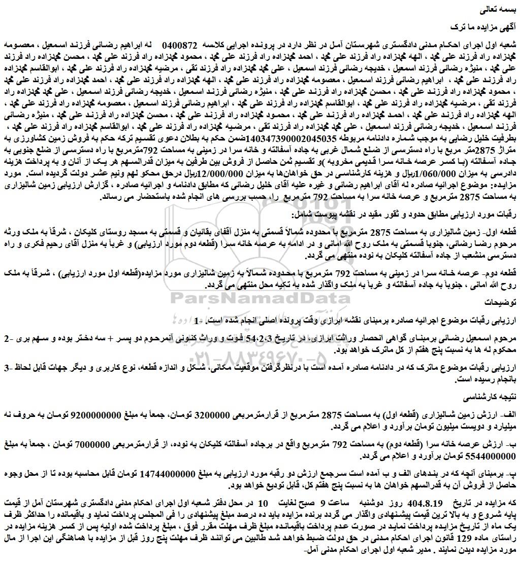 شعبه اول اجرای احکام مدنی دادگستری شهرستان آمل در نظر دارد در پرونده اجرایی کلاسه 0400872 له ابراهیم رضائی فرزند اسمعیل ، معصومه محمدزاده راد فرزند علی محمد ، الهه محمدزاده راد فرزند علی محمد ، احمد محمدزاده راد فرزند علی محمد ، محمود محمدزاده راد فرزند علی محمد ، محسن محمدزاده راد فرزند علی محمد ، منیژه رضائی فرزند اسمعیل ، خدیجه رضائی فرزند اسمعیل ، علی محمد محمدزاده راد فرزند تقی ، مرضیه محمدزاده راد فرزند علی محمد ، ابوالقاسم محمدزاده راد فرزند علی محمد ، ابراهیم رضائی فرزند اسمعیل ، معصومه محمدزاده راد فرزند علی محمد ، الهه محمدزاده راد فرزند علی محمد ، احمد محمدزاده راد فرزند علی محمد ، محمود محمدزاده راد فرزند علی محمد ، محسن محمدزاده راد فرزند علی محمد ، منیژه رضائی فرزند اسمعیل ، خدیجه رضائی فرزند اسمعیل ، علی محمد محمدزاده راد فرزند تقی ، مرضیه محمدزاده راد فرزند علی محمد ، ابوالقاسم محمدزاده راد فرزند علی محمد ، ابراهیم رضائی فرزند اسمعیل ، معصومه محمدزاده راد فرزند علی محمد ، الهه محمدزاده راد فرزند علی محمد ، احمد محمدزاده راد فرزند علی محمد ، محمود محمدزاده راد فرزند علی محمد ، محسن محمدزاده راد فرزند علی محمد ، منیژه رضائی فرزند اسمعیل ، خدیجه رضائی فرزند اسمعیل ، علی محمد محمدزاده راد فرزند تقی ، مرضیه محمدزاده راد فرزند علی محمد ، ابوالقاسم محمدزاده راد فرزند علی محمد ، بطرفیت خلیل رضایی به موجب شماره دادنامه مربوطه 140347390002045035ضمن حکم به بطلان دعوی تقسیم ترکه حکم به فروش زمین کشاورزی به متراژ 2875متر مربع با راه دسترسی از ضلع شمال غربی به جاده آسفالته و خانه سرا در زمینی به مساحت 792مترمربع با راه دسترسی از ضلع جنوبی به جاده آسفالته (با کسر عرصه خانه سرا قدیمی مخروبه )و تقسیم ثمن حاصل از فروش بین طرفین به میزان قدرالسهم هر یک از آنان و به پرداخت هزینه دادرسی به میزان 1/060/000ریال و هزینه کارشناسی در حق خواهان ها به میزان 12/000/000ریال درحق محکو لهم ونیم عشر دولت گردیده است. مورد مزایده: موضوع اجرائیه صادره له آقای ابراهیم رضائی و غیره علیه آقای خلیل رضائی که مطابق دادنامه و اجرائیه صادره ، گزارش ارزیابی زمین شالیزاری به مساحت 2875 مترمربع و عرصه خانه سرا به مساحت 792 مترمربع را، حسب بررسی های انجام شده باستحضار می رساند.
