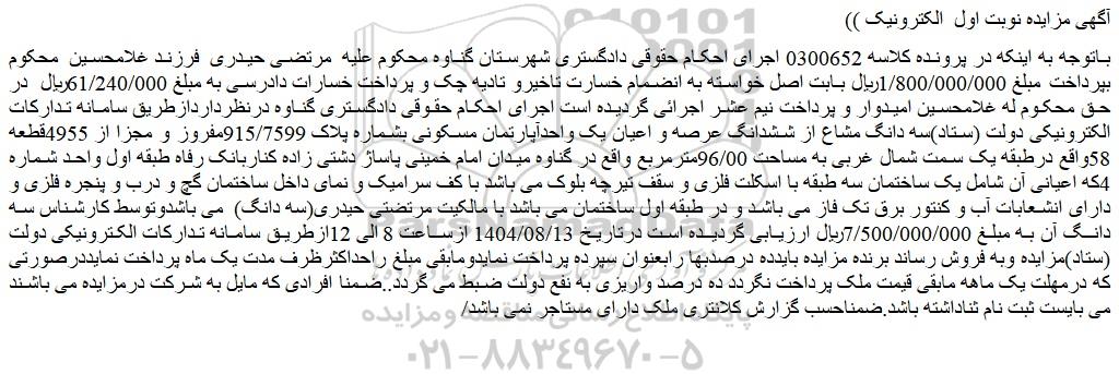 باتوجه به اینکه در پرونده کلاسه 0300652 اجرای احکام حقوقی دادگستری شهرستان گناوه محکوم علیه مرتضی حیدری فرزند غلامحسین محکوم بپرداخت مبلغ 1/800/000/000ریال بابت اصل خواسته به انضمام خسارت تاخیرو تادیه چک و پرداخت خسارات دادرسی به مبلغ 61/240/000ریال در حق محکوم له غلامحسین امیدوار و پرداخت نیم عشر اجرائی گردیده است اجرای احکام حقوقی دادگستری گناوه درنظرداردازطریق سامانه تدارکات الکترونیکی دولت (ستاد)سه دانگ مشاع از ششدانگ عرصه و اعیان یک واحدآپارتمان مسکونی بشماره پلاک 915/7599مفروز و مجزا از 4955قطعه 58واقع درطبقه یک سمت شمال غربی به مساحت 96/00مترمربع واقع در گناوه میدان امام خمینی پاساژ دشتی زاده کناربانک رفاه طبقه اول واحد شماره 4که اعیانی آن شامل یک ساختمان سه طبقه با اسکلت فلزی و سقف تیرچه بلوک می باشد با کف سرامیک و نمای داخل ساختمان گچ و درب و پنجره فلزی و دارای انشعابات آب و کنتور برق تک فاز می باشد و در طبقه اول ساختمان می باشد با مالکیت مرتضتی حیدری(سه دانگ) می باشدوتوسط کارشناس سه دانگ آن به مبلغ 7/500/000/000ریال ارزیابی گردیده است درتاریخ 1404/08/13 ازساعت 8الی 12ازطریق سامانه تدارکات الکترونیکی دولت (ستاد)مزایده وبه فروش رساند برنده مزایده بایدده درصدبها رابعنوان سپرده پرداخت نمایدومابقی مبلغ راحداکثرظرف مدت یک ماه پرداخت نمایددرصورتی که درمهلت یک ماهه مابقی قیمت ملک پرداخت نگردد ده درصد واریزی به نفع دولت ضبط می گردد..ضمنا افرادی که مایل به شرکت درمزایده می باشند می بایست ثبت نام ثناداشته باشد.ضمناحسب گزارش کلانتری ملک دارای مستاجر نمی باشد/