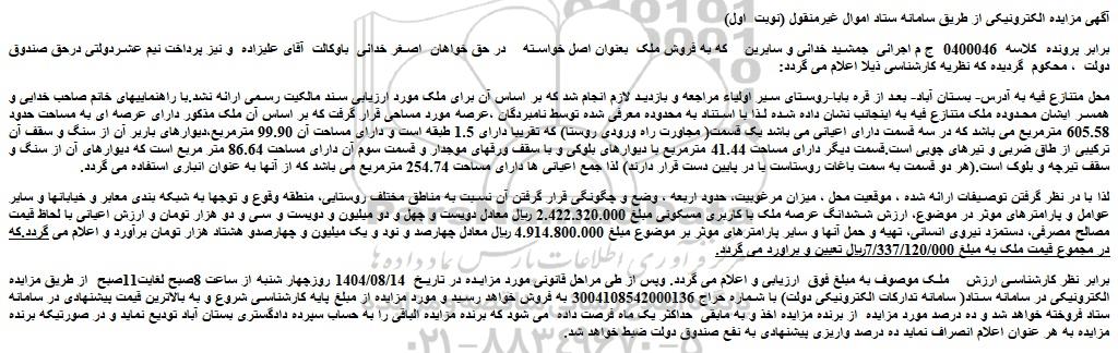 آگهی مزایده الکترونیکی از طریق سامانه ستاد اموال غیرمنقول (نوبت اول)