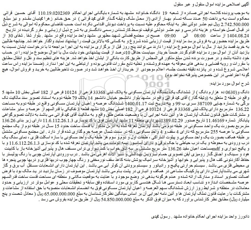 به موجب پرونده کلاسه اجرائی صادره از شعبه 19 دادگاه خانواده مشهد به شماره بایگانی اجرای احکام 110.19.0202369 آقای حسین قرائی محکوم است به پرداخت 50 عدد سکه تمام بهار آزادی (از محل ملک وثیقه گذار اقای محمد قرائی ) در حق خانم زهرا محمدیان مقدم و نیز مبلغ 2.742.500.000 ریال نیم عشر دولتی نظر به اینکه محکوم علیه نسبت به پرداخت دیونش اقدامی نکرده است حسب تقاضای محکوم له اموالی به شرح ذیل در قبال اصل خواسته و هزینه دادرسی و نیم عشر دولتی توقیف توسط کارشناس رسمی دادگستری به شرح ذیل ارزیابی و مقرر گردیده در تاریخ 1404.08.24 از ساعت 08:00 الی 09:00 صبح در مجتمع قضائی شهید مطهری مشهد واحد مزایده واقع در مشهد . بلوار شفا . شفای 30 از طریق مزایده حضوری به فروش برسد مزایده از قیمت ارزیابی شده شروع و به کسانی که بالاترین قیمت را پیشنهاد نمایند واگذار خواهد شد. چنانچه طالبین به خرید قصد بازدید از مال یا اموال موضوع مزایده را دارند می توانند پنج روز قبل از برگزاری مزایده به این اجرا مراجعه تا با درخواست ایشان نسبت به بازدید آنان از اموال مورد مزایده اقدام گردد. ضمناً خریدار میبایست حداقل 10درصد از قیمت پیشنهادی خود بابت مال یا اموال موضوع مزایده را در حساب خود داشته باشند و در صورت برنده شدن مبلغ مذکور فی المجلس از طریق کارت بانکی از ایشان اخذ خواهد شد. هزینه های تنظیم سند و نقل و انتقال مطابق با مقررات و رویه قضایی و بدهی های معوقه به عهده فروشنده و تخلیه تابع مقررات قانونی بوده و ارتباطی به این اجرا ندارد. (ضمنا مزایده راس ساعت اعلامی شروع شده و در پانزده دقیقه نخست جلسه، اعلام موجودی از خریداران اخذ خواهد شد ودر صورت تاخیرطالبین به خرید و فروش اموال، هیچ گونه اعتراضی در این خصوص پذیرفته نخواهد بود)