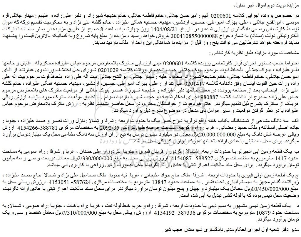 در خصوص پرونده اجرایی کلاسه 0200601 لهم : امیرحسن جلالی، خانم فاطمه جلالی، خانم خدیجه شهرزاد و دلبر علی زاده و علیهم : مهناز جلالی قره موسی ، ابوالفتح جلالی ، علی، بهزاد، امیرعلی، حسین، اردشیر، مهدیه، حسنیه همگی علیزاده ، خانم گلشه علی نژاد و به محکومیت تقسیم ترکه که اموال توسط کارشناس رسمی دادگستری ارزیابی شده و در تاریخ 1404/08/21 روز چهارشنبه ساعت 8 صبح از طریق مزایده در بستر سامانه تدارکات الکترونیکی دولت (ستاد) به شماره حراج 3004108550000088 بفروش خواهد رسید ، مزایده از مبلغ پایه شروع وبه کسانیکه بالاترین قیمت را پیشنهاد نمایند فروخته خواهد شد.طالبین می توانند پنج روز قبل از مزایده با هماهنگی این واحد از ملک بازدید نمایند.