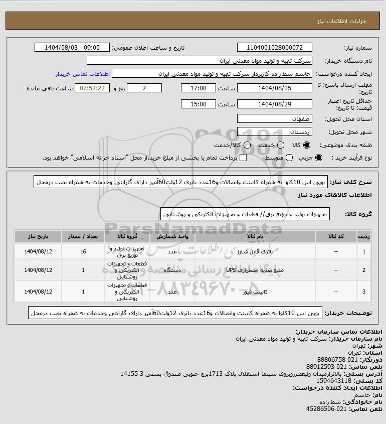 | 2 | -- | منبع تغذیه اضطراری UPS | دستگاه | قطعات و تجهیزات الکتریکی و روشنایی | 1 | 1404/08/12 |
