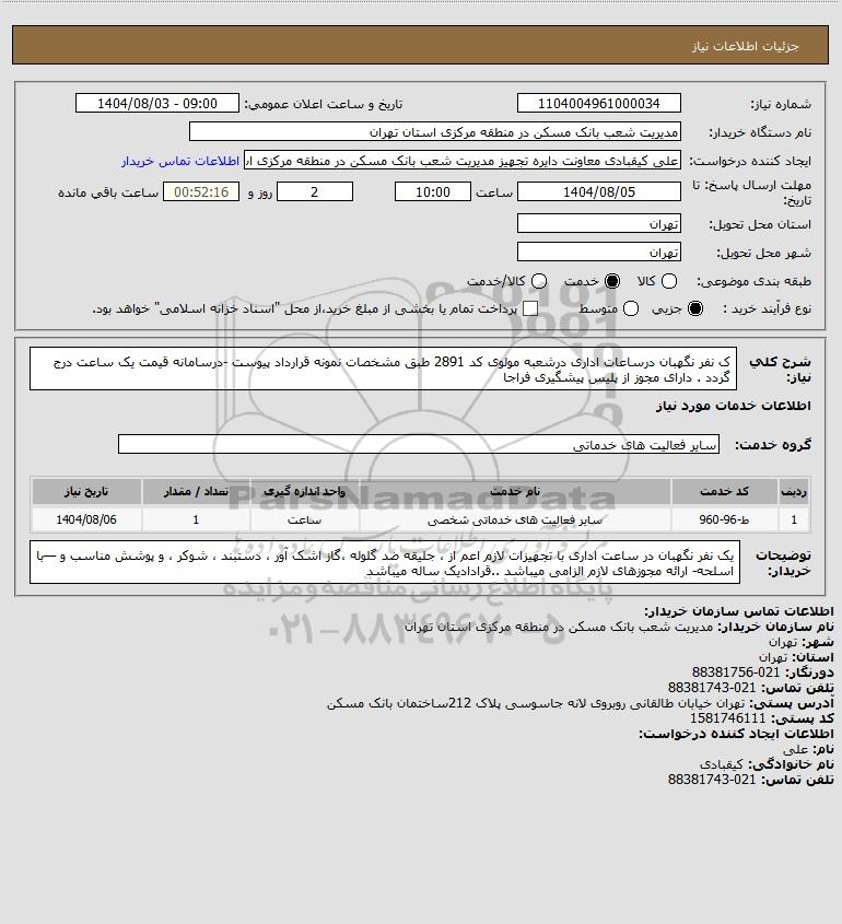 شرح کلی نیاز: ک نفر نگهبان درساعات اداری درشعبه مولوی کد 2891 طبق مشخصات نمونه قرارداد پیوست -درسامانه قیمت یک ساعت درج گردد . دارای مجوز از پلیس پیشگیری فراجا