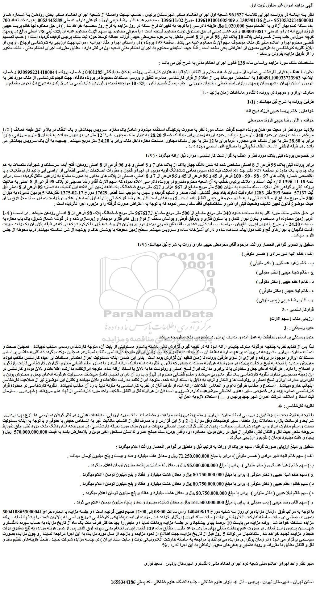 مشخصات ملک مورد مزایده براساس ماده 138 قانون اجرای احکام مدنی به شرح ذیل می باشد :