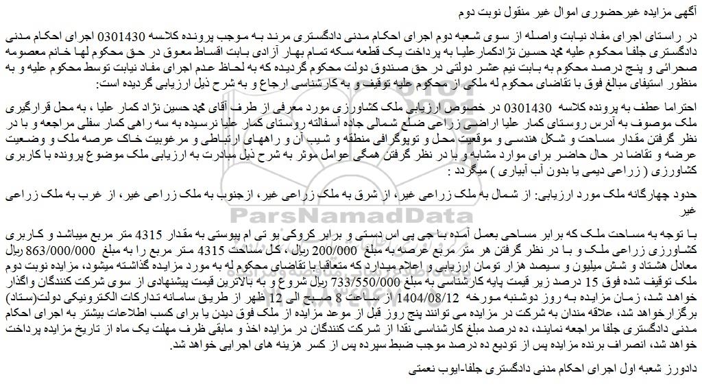 با توجه به مساحت ملک که برابر مساحی بعمل آمده با جی پی اس دستی و برابر کروکی یو تی ام پیوستی به مقدار 4315 متر مربع میباشد و کاربری کشاورزی زراعی ملک و با در نظر گرفتن هر متر مربع عرصه به مبلغ  200/000 ریال ، کل مساحت 4315 متر مربع را به مبلغ  863/000/000 ریال معادل هشتاد و شش میلیون و سیصد هزار تومان ارزیابی و اعلام میدارد که متعاقبا با تقاضای محکوم له به مورد مزایده گذاشته میشود، مزایده نوبت دوم ملک توقیف شده فوق 15 درصد زیر قیمت پایه کارشناسی به مبلغ 733/550/000 ریال شروع و به بالاترین قیمت پیشنهادی از سوی شرکت کنندگان واگذار خواهد شد، زمان مزایده به روز دوشنبه مورخه  1404/08/12 از ساعت 8 صبح الی 12 ظهر از طریق سامانه تدارکات الکترونیکی دولت(ستاد) برگزارخواهد شد، علاقه مندان به شرکت در مزایده می توانند پنج روز قبل از موعد مزایده از ملک فوق دیدن یا برای کسب اطلاعات بیشتر به اجرای احکام مدنی دادگستری جلفا مراجعه نمایند، ده درصد مبلغ کارشناسی نقدا از شرکت کنندگان در مزایده اخذ و مابقی ظرف مهلت یک ماه از تاریخ مزایده پرداخت خواهد شد، انصراف برنده مزایده پس از تودیع ده درصد موجب ضبط سپرده پس از کسر هزینه های اجرایی خواهد شد.