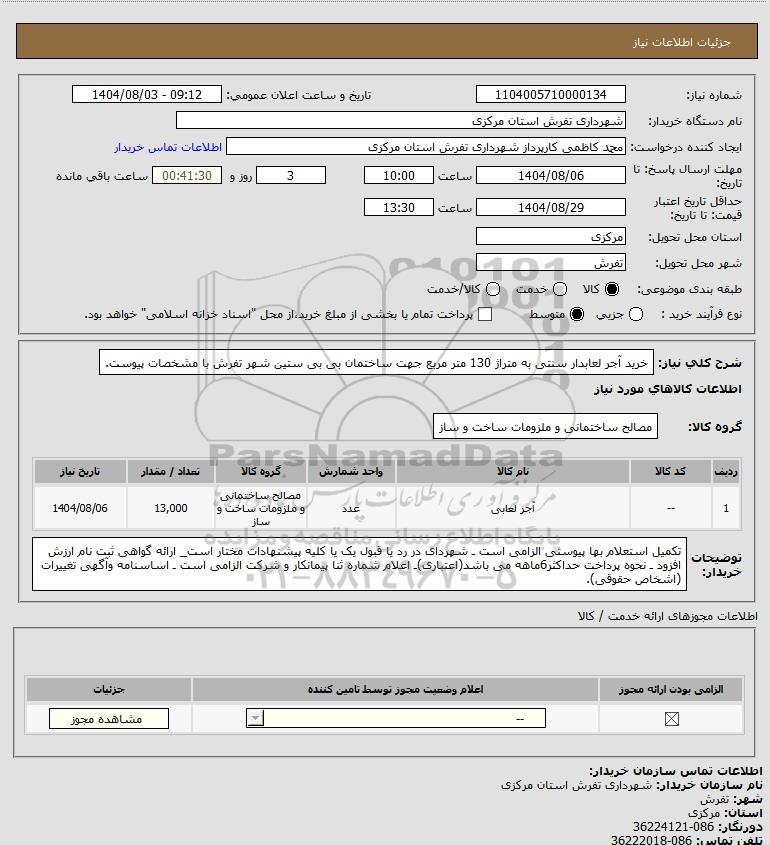 | 1 | -- | آجر لعابی | عدد | مصالح ساختمانی و ملزومات ساخت و ساز | 13,000 | 1404/08/06 |