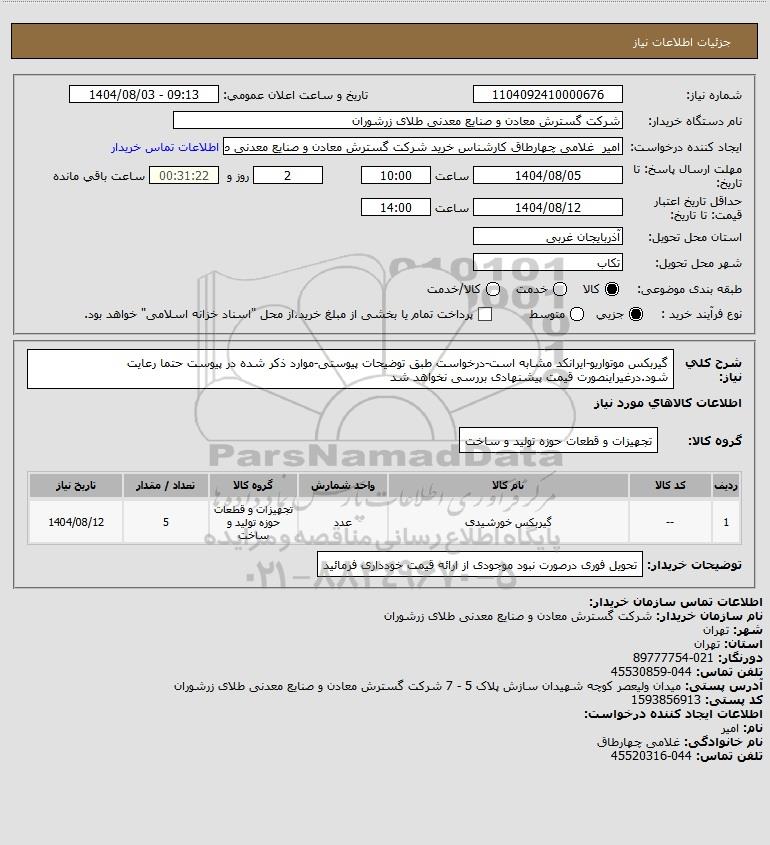 نام دستگاه خریدار:شرکت گسترش معادن و صنایع معدنی طلای زرشوران