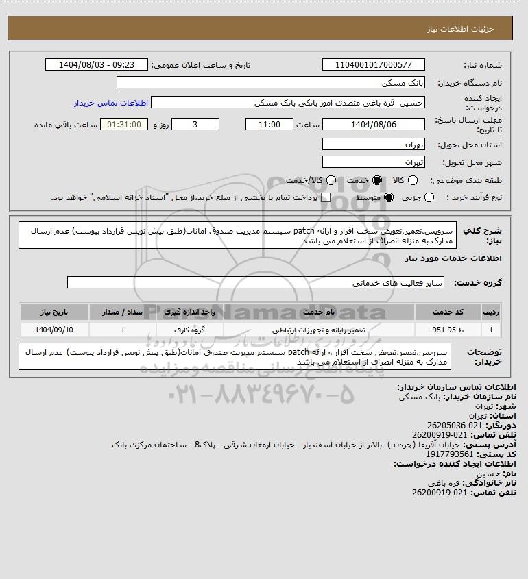 استعلام سرویستعمیرتعویض سخت افزار و ارائه patch سیستم مدیریت صندوق امانات(طبق پیش نویس قرارداد پیوست) عدم ارسال مدارک به منزله انصراف از استعلام می باشد, استعلام سرویس،تعمیر،تعویض سخت افزار و ارائه patch سیستم مدیریت صندوق امانات(طبق پیش نویس قرارداد پیوست) عدم ارسال مدارک به منزله انصراف از استعلام می باشد