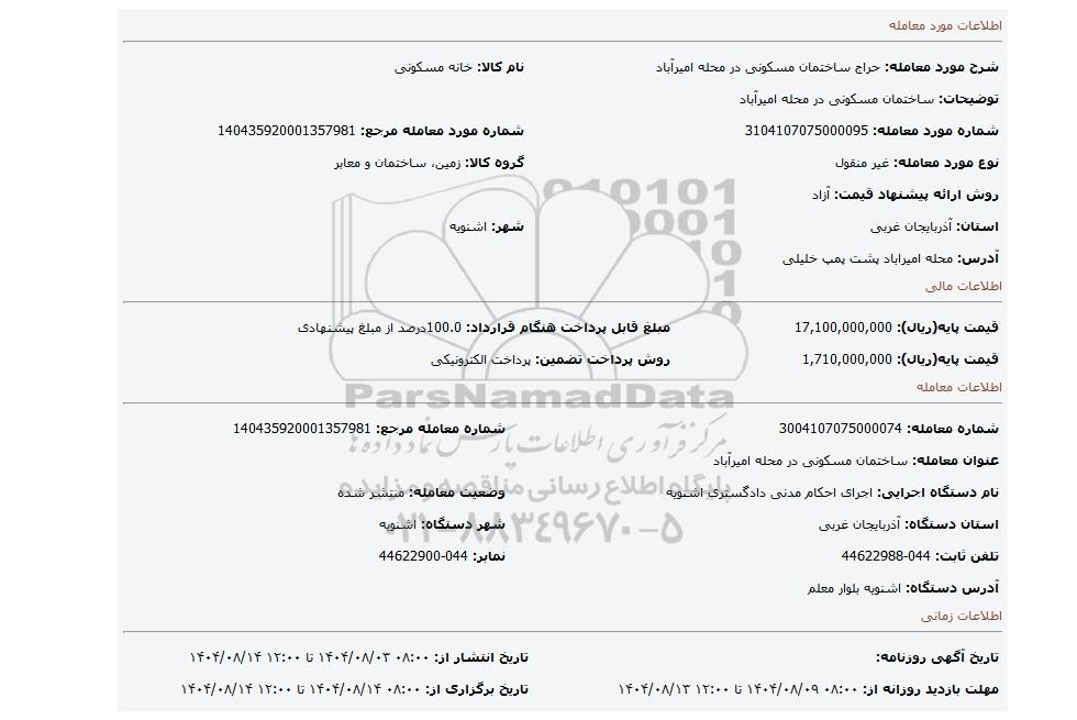 مزایده عمومی مزایده ساختمان مسکونی در محله امیرآباد برگزار میگردد. از کلیه افراد متخصص و شرکت‌های واجد شرایط دعوت به عمل می‌آید تا در این مزایده با کد خبرگزاری پارس نماد : 9745240 شرکت نمایند تاریخ شروع مزایده : 1404/08/03 مهلت شرکت در مزایده: تا پایان روز 1404/08/14 مکان برگزاری اموال واگذاری استان‌های آذربایجان غربی و دسته‌بندی‌های مربوط به این حراجی املاک و زمین میباشد.