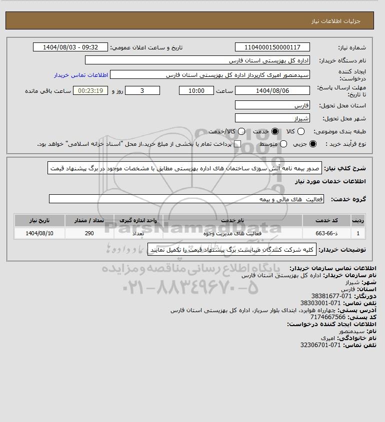 شرح کلی نیاز: صدور بیمه نامه آتش سوزی ساختمان های اداره بهزیستی مطابق با مشخصات موجود در برگ پیشنهاد قیمت