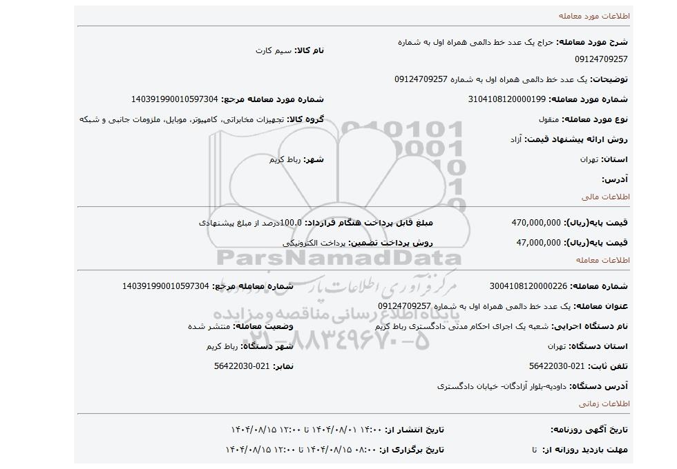 مزایده یک عدد خط دائمی همراه اول به شماره 09124709257, مزایده، یک عدد خط دائمی همراه اول به شماره 09124709257