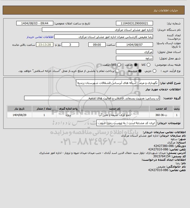 شرح کلی نیاز: نگهداری و مرمت شبکه های آبرسانی قشلاقات شهرستان زرندیه
