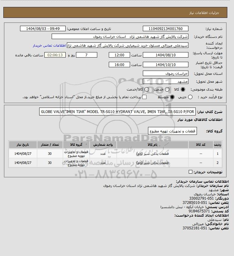 شرح کلی نیاز: GLOBE VALVE"IMEN TIAR" MODEL TR-SG10 HYDRANT VALVE, IMEN TIAR, TR-SG10 P/FOR