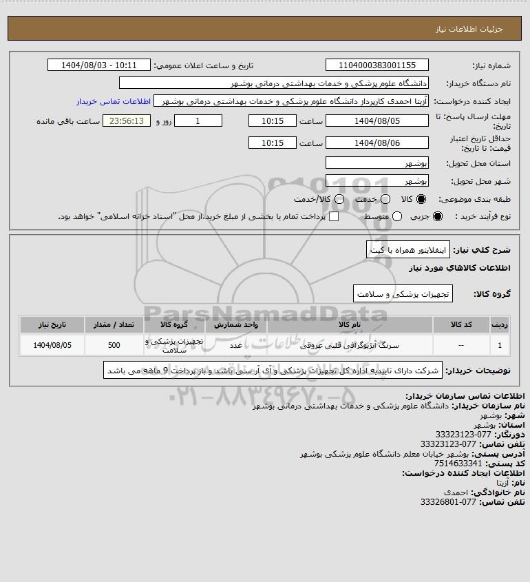 استعلام بها و موضوع استعلام استعلام اینفلایتور همراه با کیت به اطلاع کلیه شرکتها و افراد متخصص واجد شرایط میرساند، آگهی گذار در نظر دارد از طریق استعلام بها، نسبت به انتخاب و دریافت پیشنهادات اقدام نماید. این استعلام با کد آگهی ثبت شده در سامانه خبرگزاری پارس نماد : 9745731 منتشر شده است. مشخصات استعلام : تاریخ شروع استعلام: 1404/08/03 آخرین مهلت ارسال پیشنهاد قیمت : 1404/08/05 و محل اجرای پروژه : استان بوشهر میباشد. استعلام قیمت مورد درخواست : استعلام اینفلایتور همراه با کیت با دستهبندیهای تخصصی و گروه های مرتبط : خدمات و تجهیزات آزمایشگاهی و پزشکی, استعلام اطلاع رسانی میگردد. شرایط شرکت در استعلام آنلاین : ابتدا ثبت نام در سامانه استعلام پارس نماد و تکمیل مدارک موردنیاز و بارگذاری در سامانه رعایت تمامی ضوابط و الزامات مندرج در اسناد استعلام است.